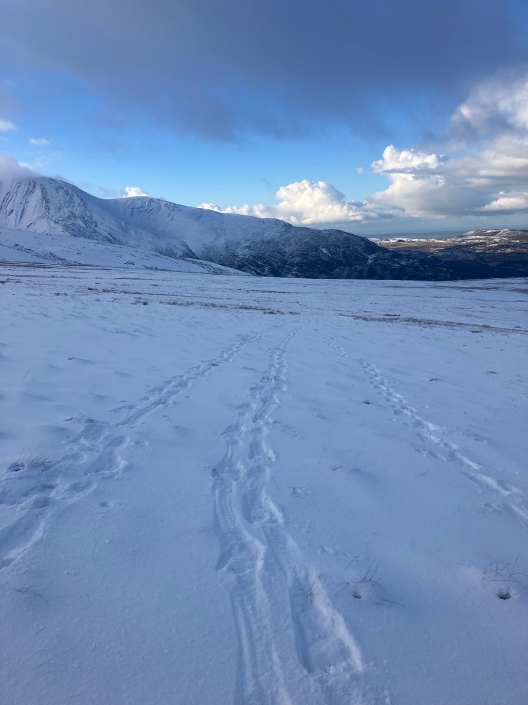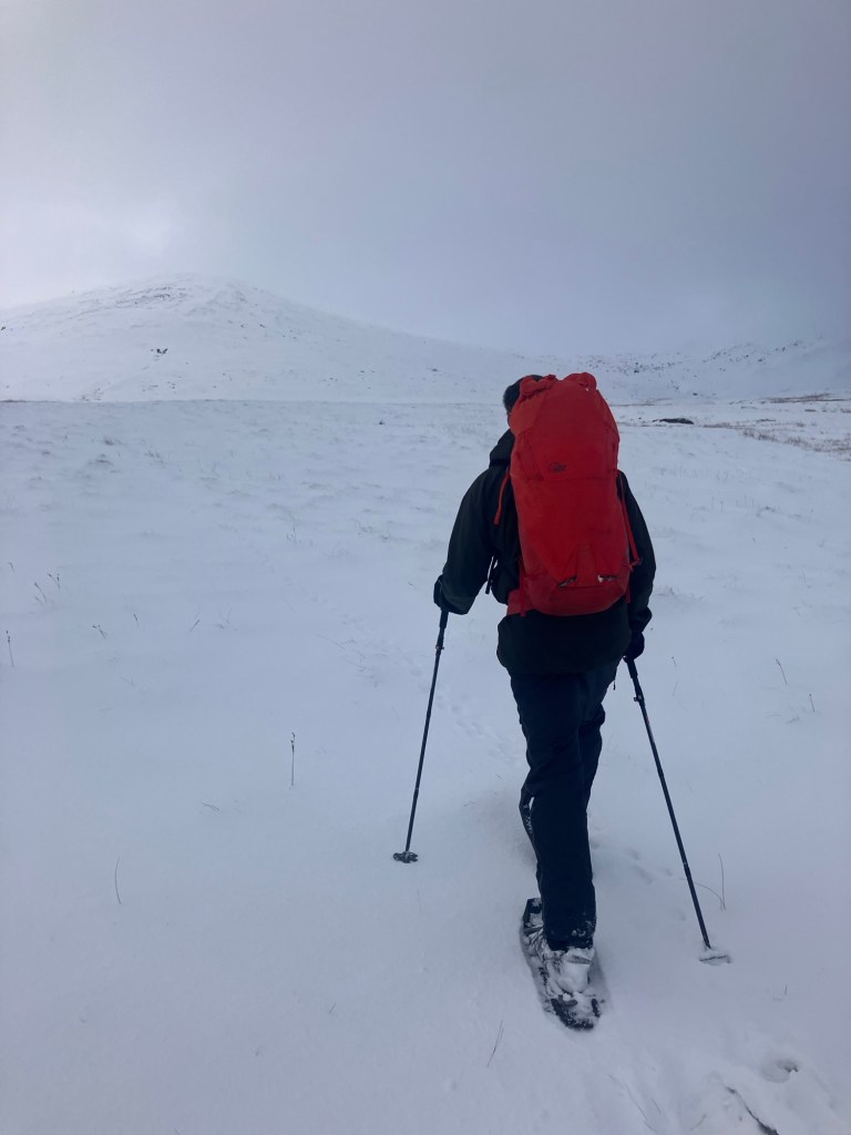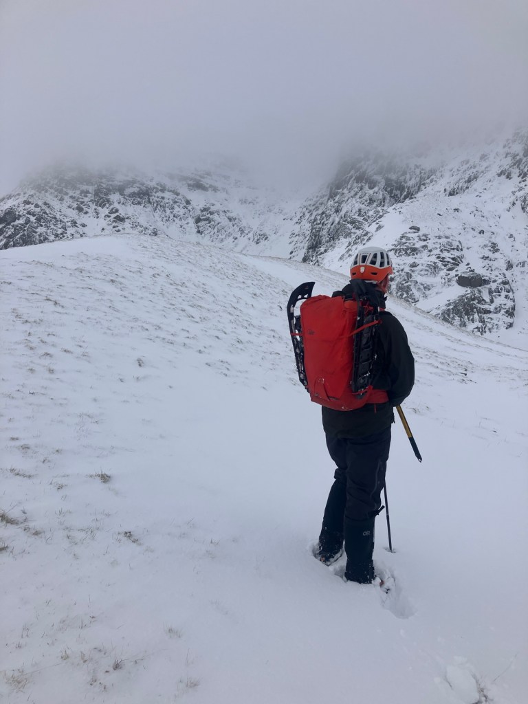 We opted to hike up to the Crib Lem Spur – a rocky ridge that leads up to the summit of Carnedd Dafydd. It’s a long hike in any conditions, but felt a really long way today. We chose to start in the Nant Ffrancon valley and traverse into the ridge, so as to make a circuit of the day. The snow shoes meant that we could cross the usually boggy and impassable ground without too much trouble.
