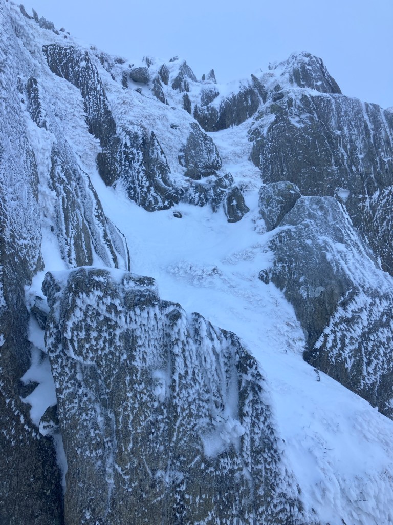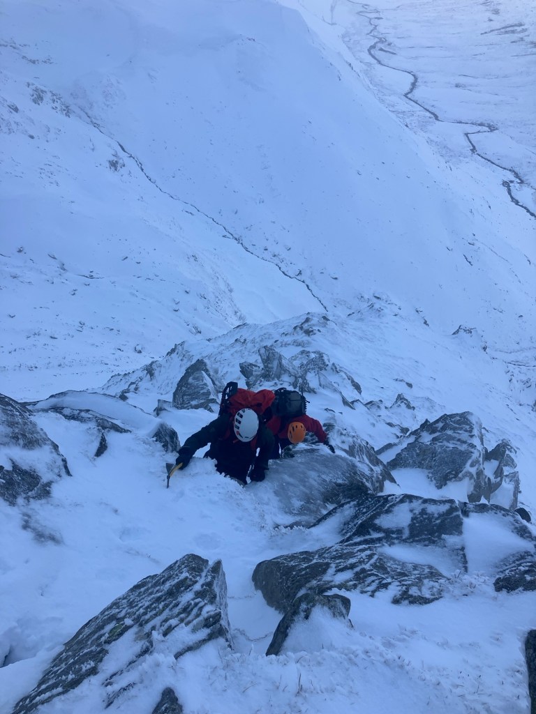 It took a staggering two and a half hours to reach the base of the climbing part of the ridge! Much longer than usual. It was worth the effort though as conditions on the ridge were superb. Hard snow for crampons to bite into and all the rocks were rimed with big feathers of ice.