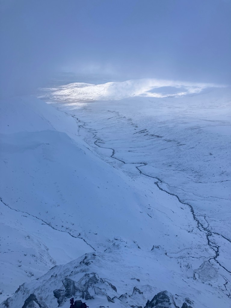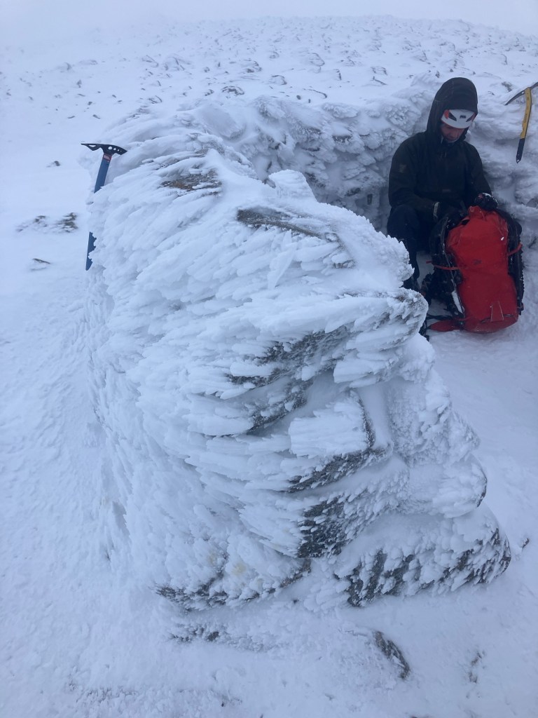 The summit cairn was decorated in beautiful feathers of rime ice and a bitterly cold wind was roaring across the tops.