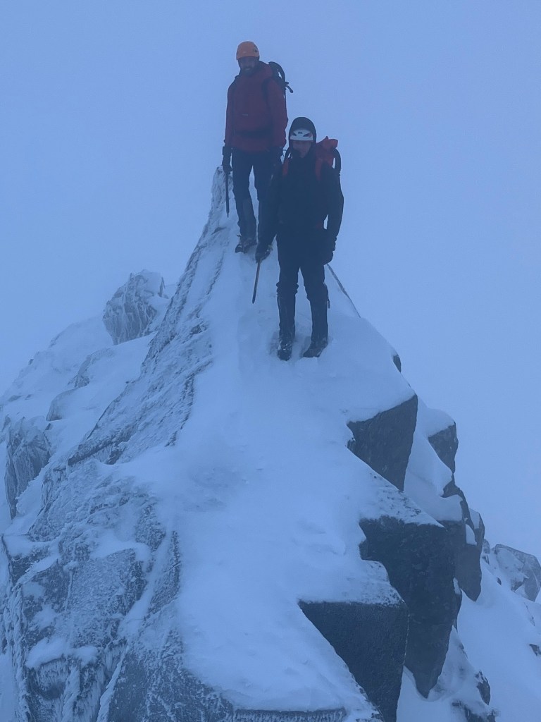 We huddled in for some food and drink, while planning the descent route. It was no place to loiter, with a minus double figures wind chill, any exposed skin felt almost painful.