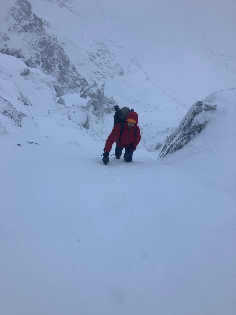 John stayed true to the crest of the ridge, but Aled and I climbed some of the snow gullies either side of it as we made our way up.