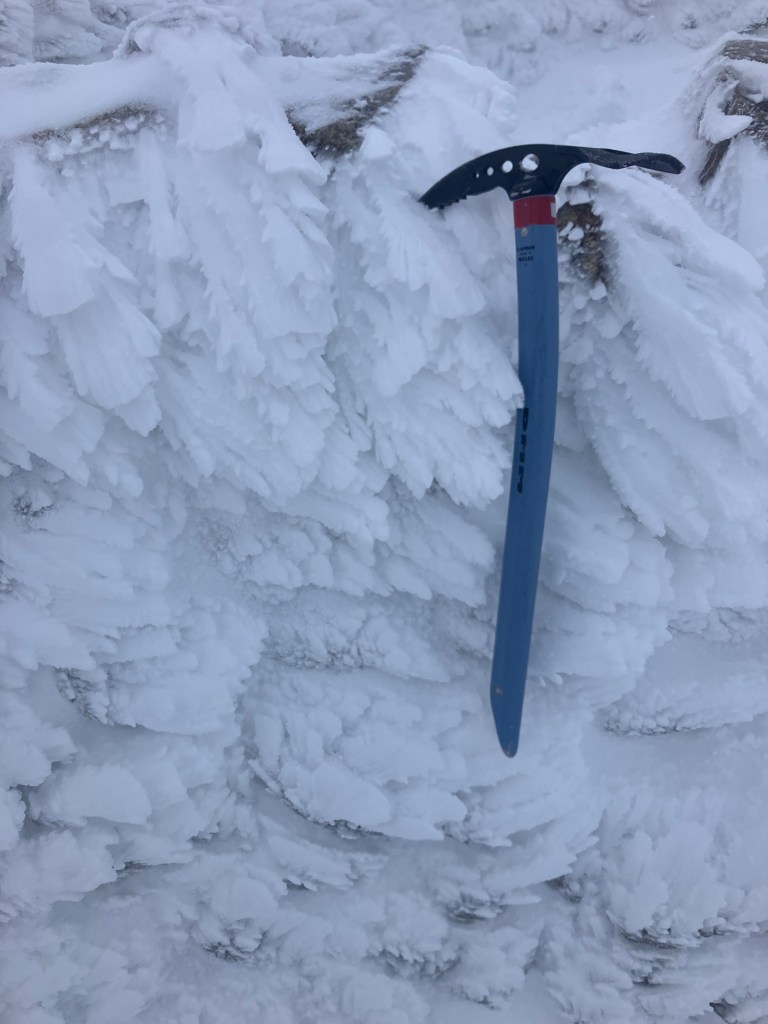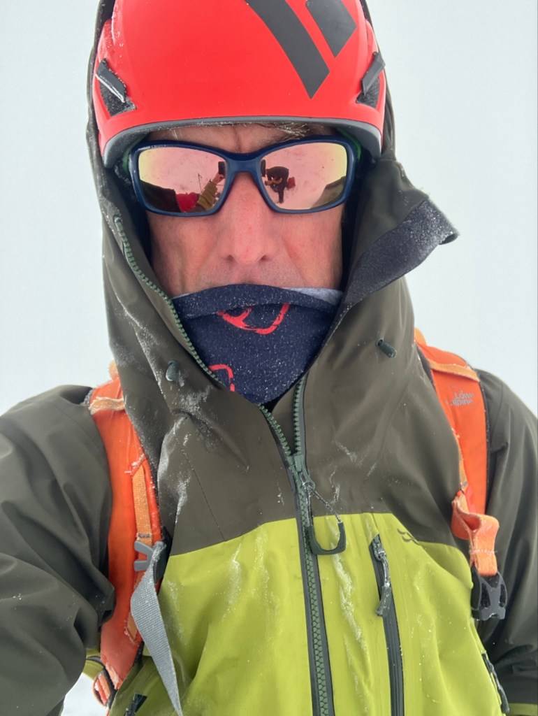 Although we were in the mist, I wore glasses to keep the snow glare off, but to also protect myself from the wind and any snow that was getting blown around. Our jackets and packs started to rime with ice as well. It was time to head down!