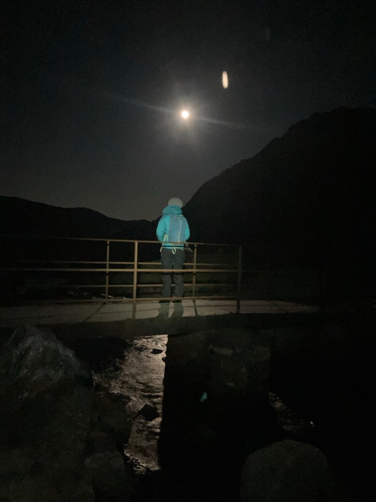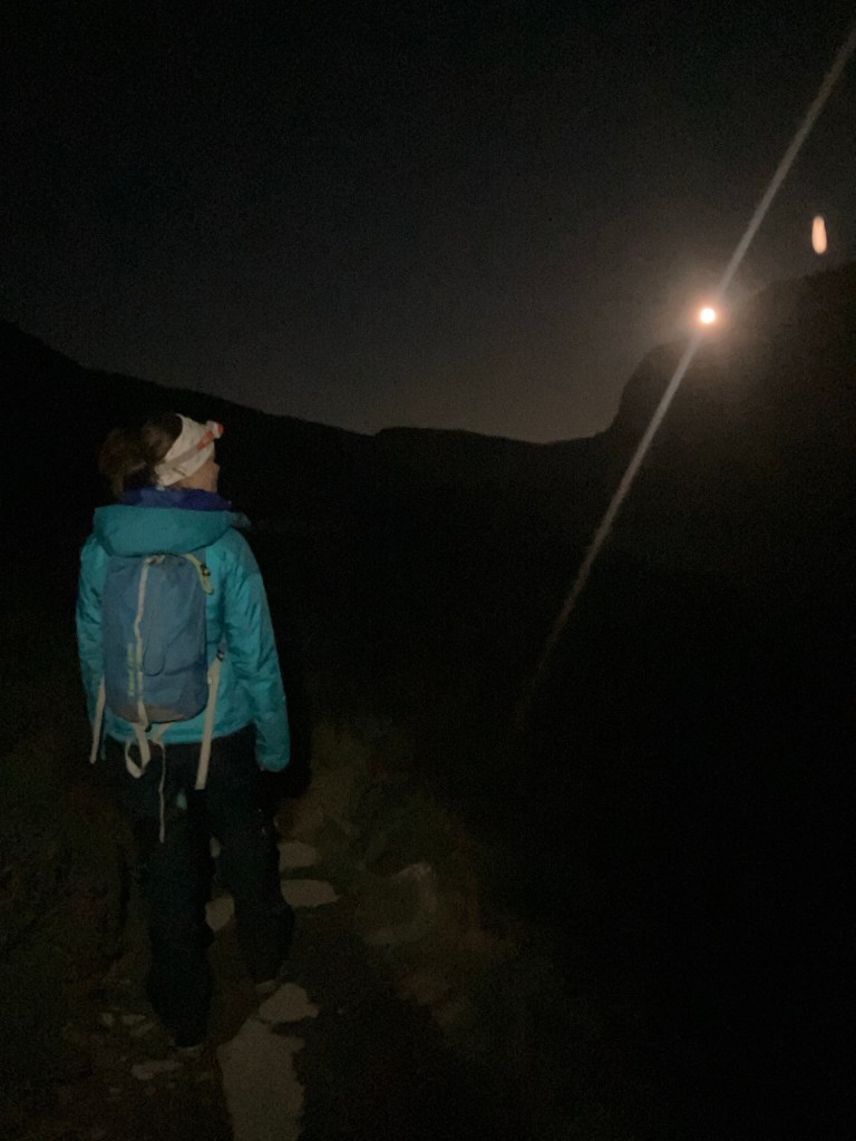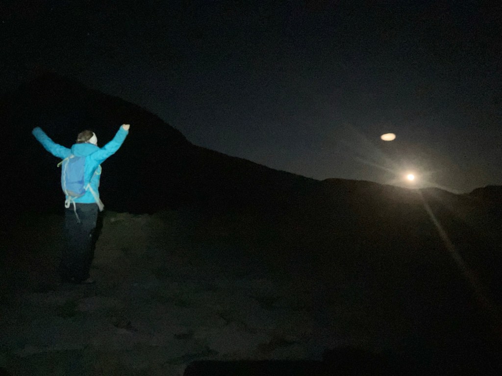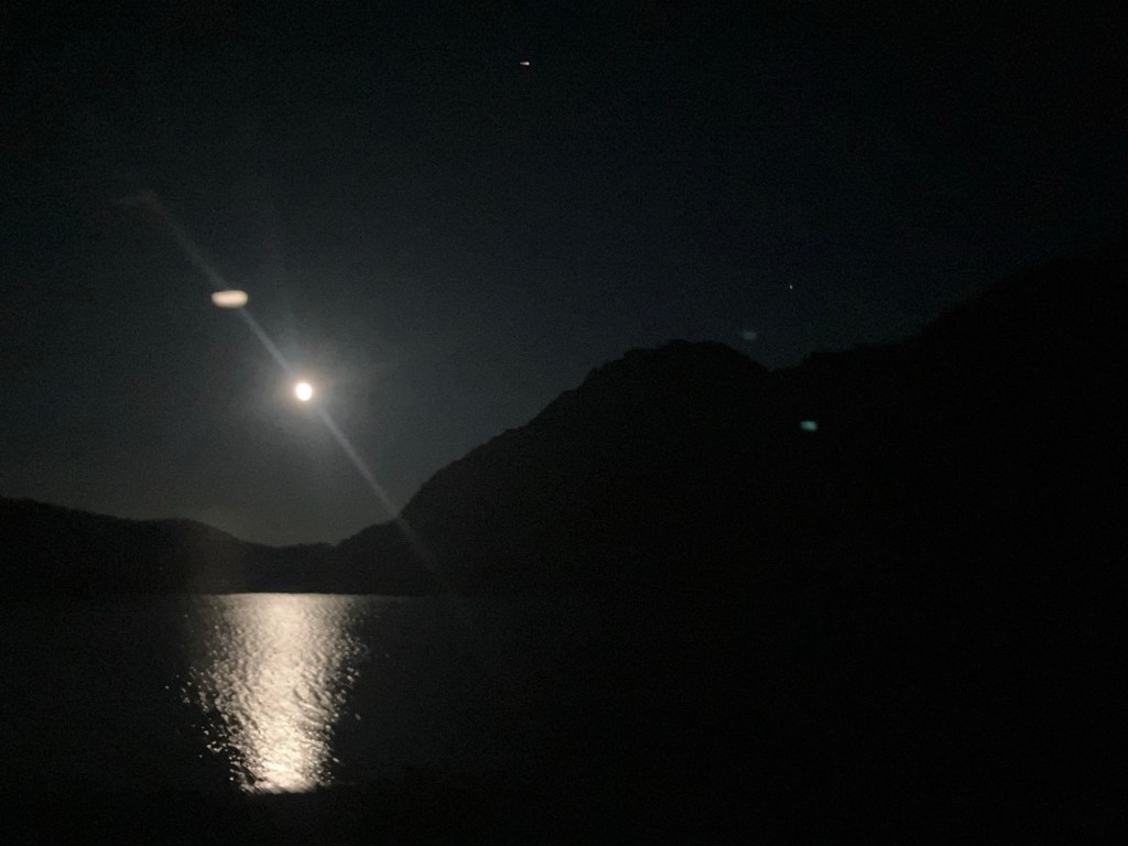 We walked up in pitch black, with a sky full of stars (my camera isn’t good enough for great photos, but you get the idea). As we arrived at the lake shore, the moon rose over the horizon.