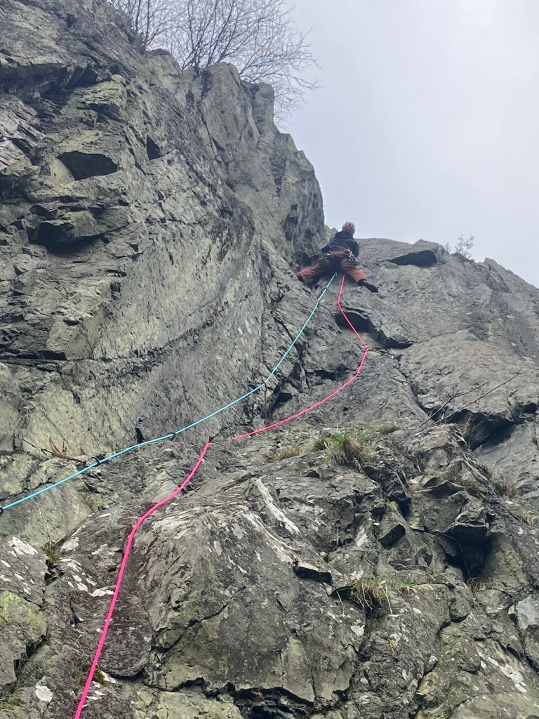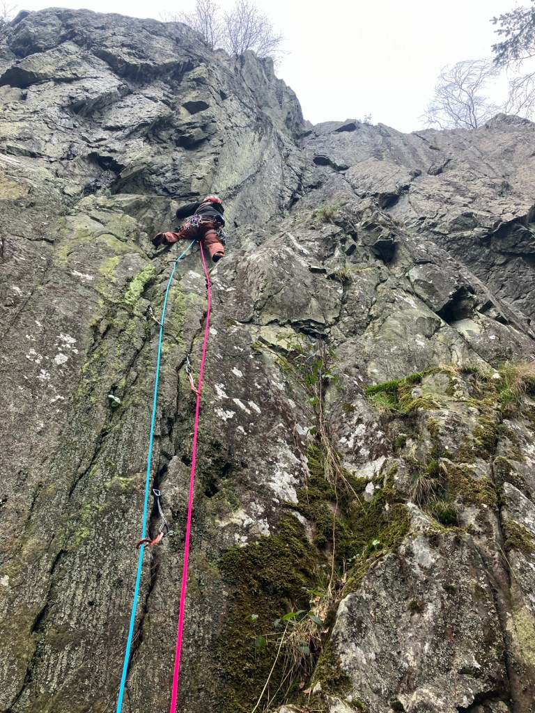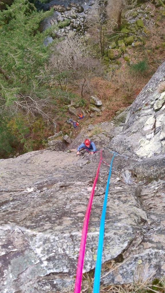 In my old ‘Paul Williams’ climbing guidebook, this is one of the few ‘VS’ standard climbs that I’ve not yet climbed, so I was delighted to be making an ascent and ‘ticking it off’. In the new guidebook however, it receives a harder grade as it’s no longer recommended to traverse off left at this point to easier ground, due to some loose blocks.