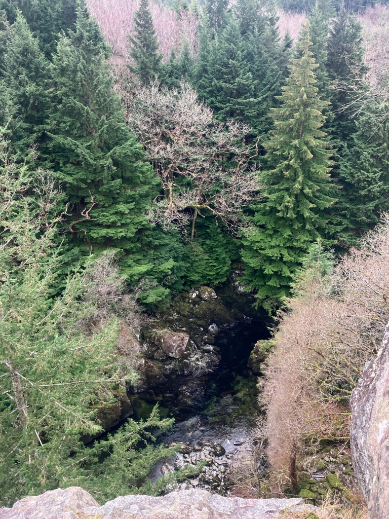 It’s not often that I get to climb on a cliff that I’ve not already visited around here, but today John and I visited two new (new to us – the cliffs have been there for years!) venues and climbed climbs that we’d not done before. All very satisfying. We thought the first venue in the Lledr Valley might be a bit damp, but looking down from the top, it seemed like we might be in luck. On a warmer day the river would have looked very inviting for a post climb swim!