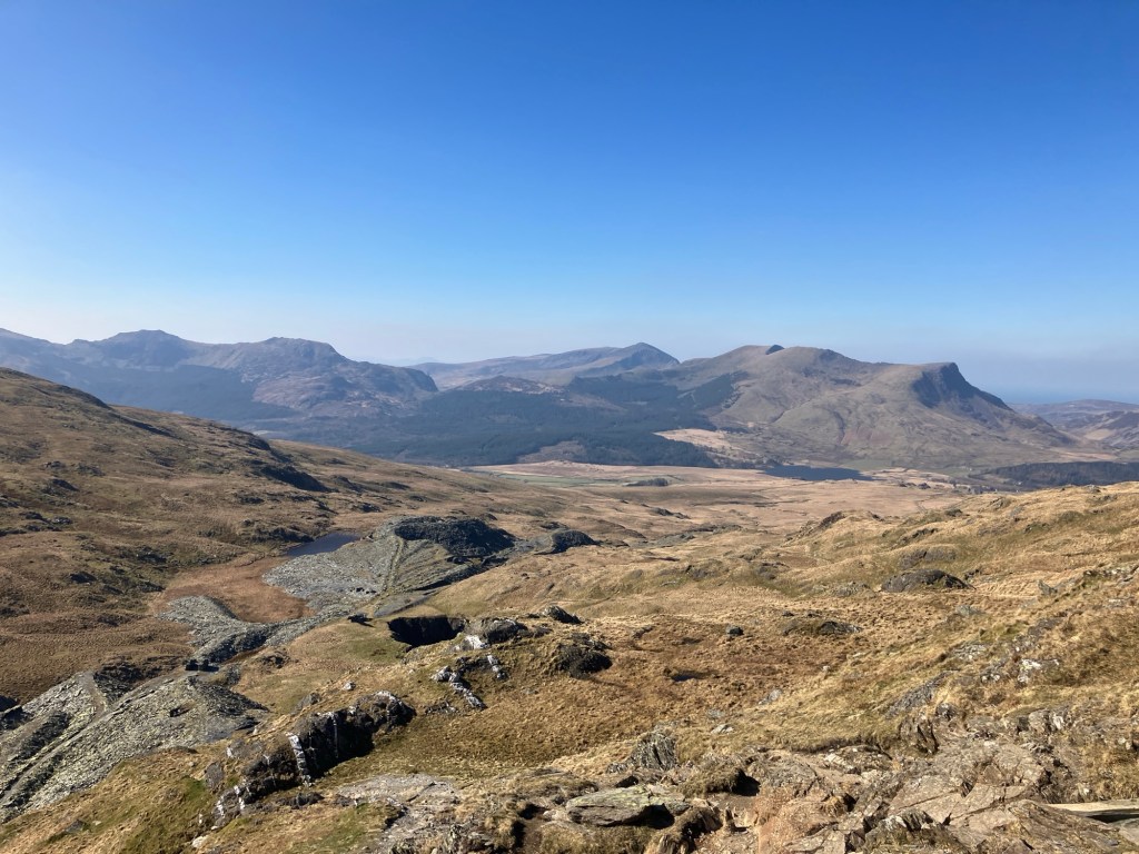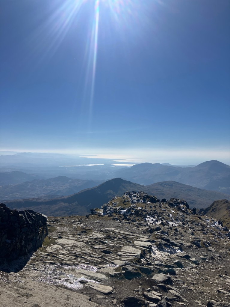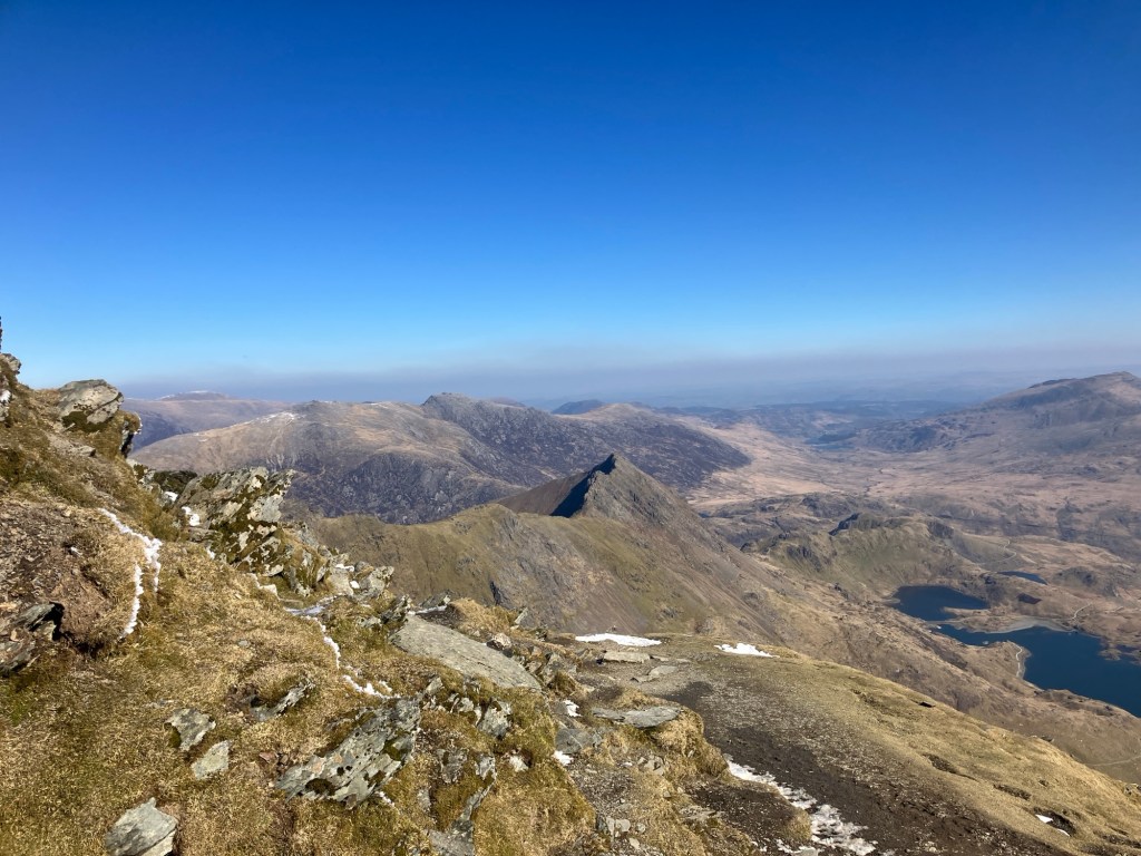 The photo below, looking out at the crest of Crib Goch, from the summit looks fairly benign, so it’s hard to convey how windy it was us there! I had to lean against the trig point to steady myself, while I tried to keep the camera level! With my glove off, I only had a few seconds to take a photo before my hand started to freeze.