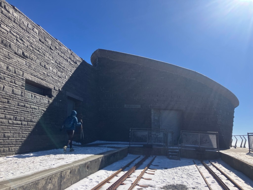 Then left the platform to find shelter on the far side, where we could eat a sandwich without fear of either freezing to getting blown over.