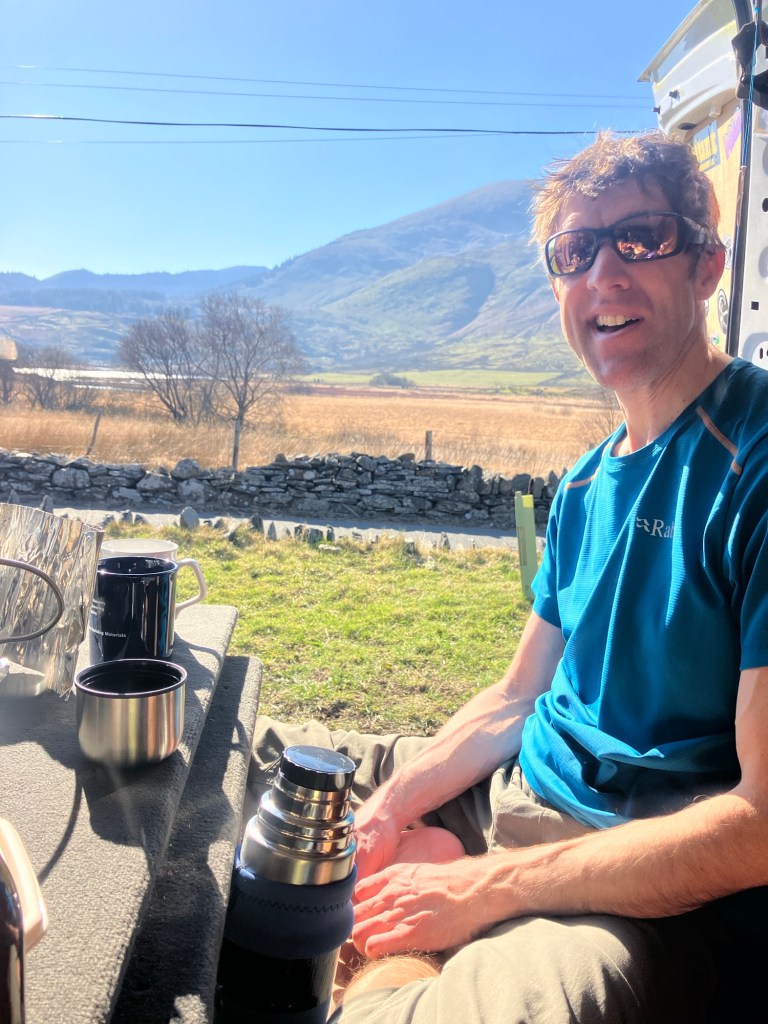 Back at the van, we managed to position ourselves with sun coming in and the wind going overhead. it had been four hours van to van. Down in the valley there wasn’t much of a breeze, but what there was, was still very cold. Sheltered, it was soon t-shirt temperatures and eventually it got so hot that I had to take my t-shirt off!