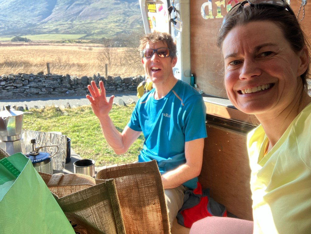 After a van brew, we drove around to Llanberis, to pick up some kit for the ski tour and drop in on Matt (for another cuppa). It was good to see Snowdon summit from the High Street and know that we’d just been up there!