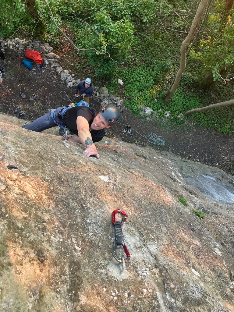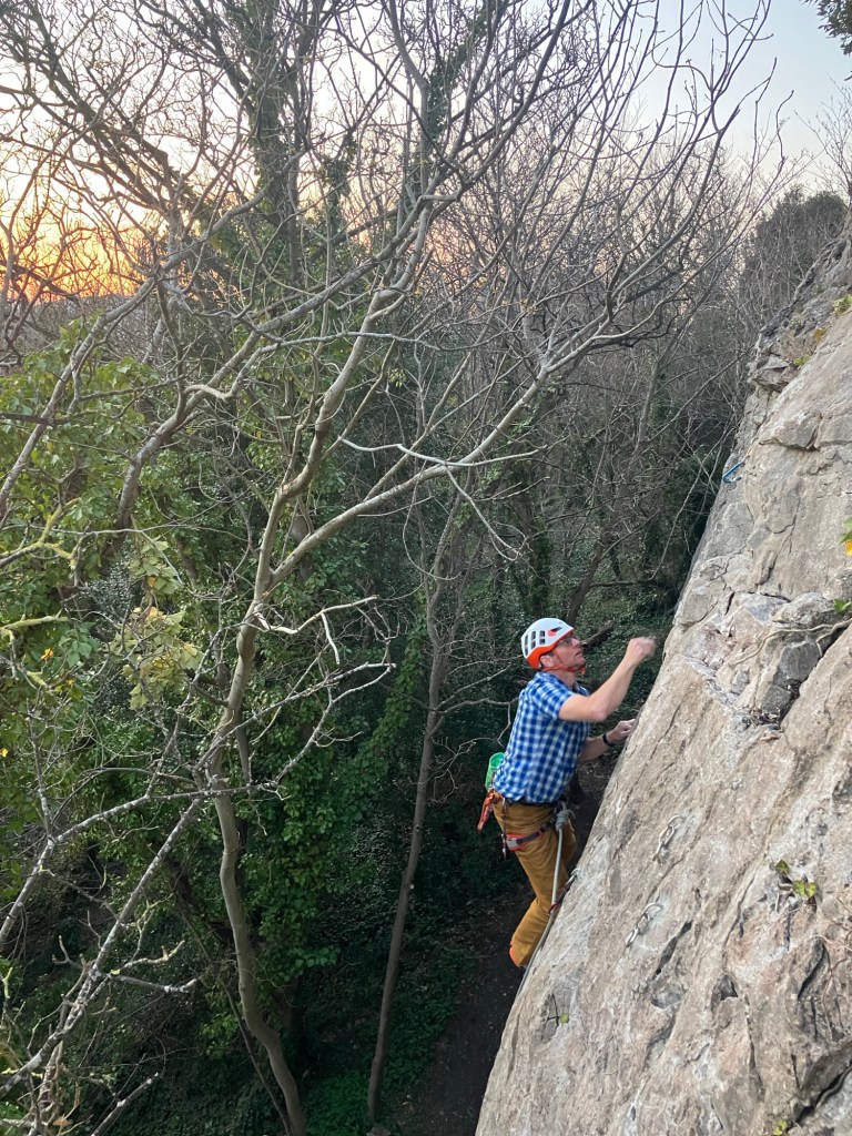 Afterwards, as the weather is so good, we decided there was just enough time, warmth and daylight to check out a new crag. Actually, it’s an old crag, but having been banned for many years, climbers are now allowed back (provided they abide by a few rules, which was fine by us). John, Andrew and Aled, who I had been working with were all up for it, so we grabbed a couple of ropes and drove over.