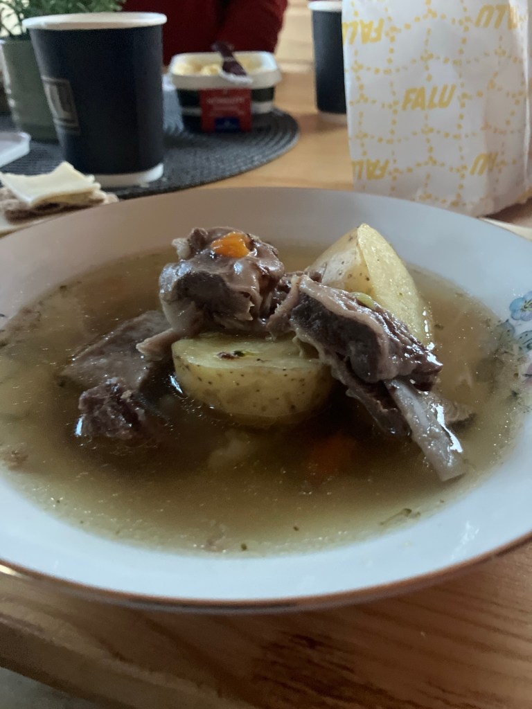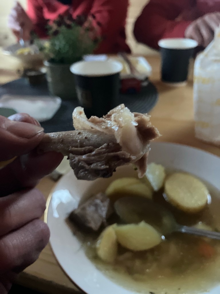 We are in a little basic cabin, but happily, the owner had got dinner waiting for us. It was moose stew. He proudly announced that he had hunted and killed it himself in the autumn! There was plenty of fat, bone and grizzle but it was pretty tasty.