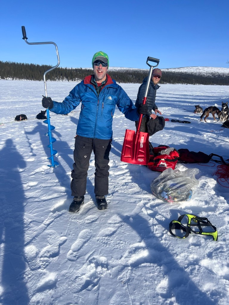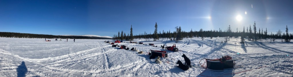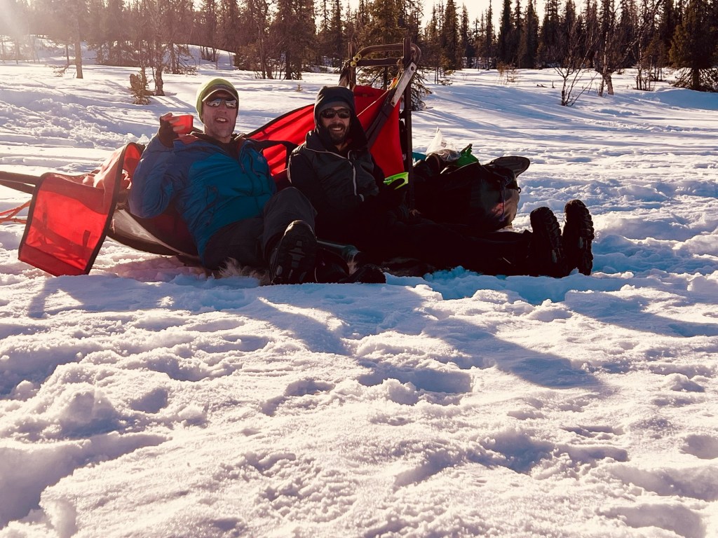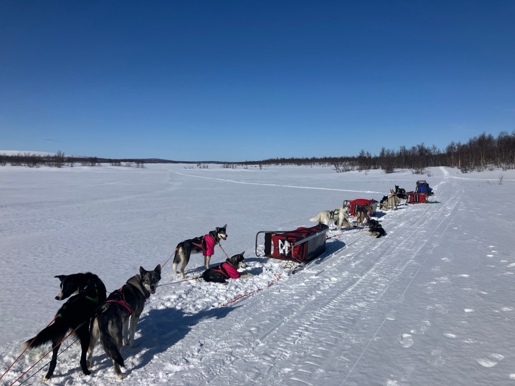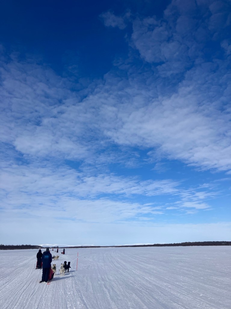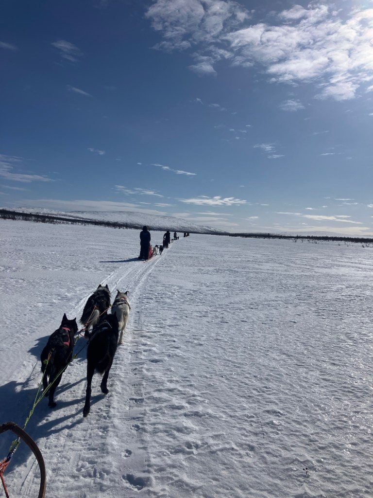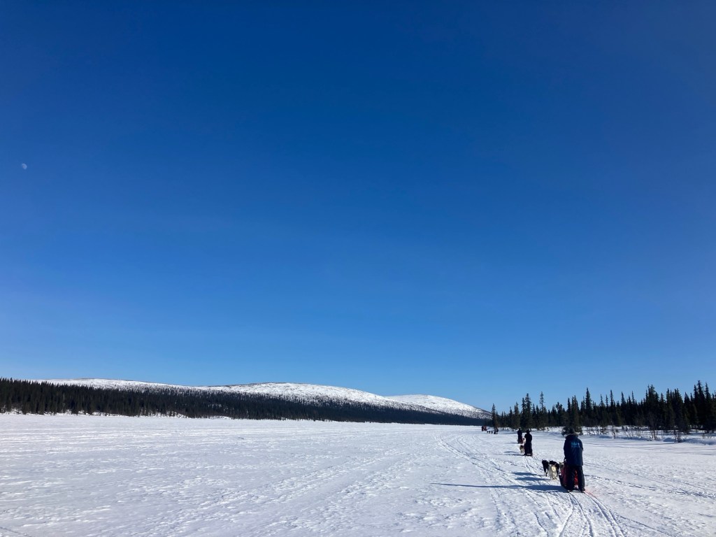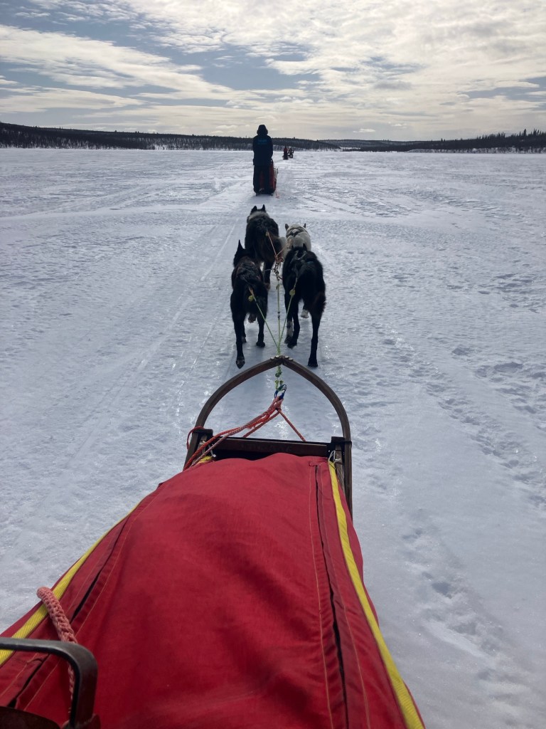 We had two ‘technical dismounts’ on the descent, but both students managed to chase their sleds down before the dogs disappeared! The sun beamed down as we entered another long lake.