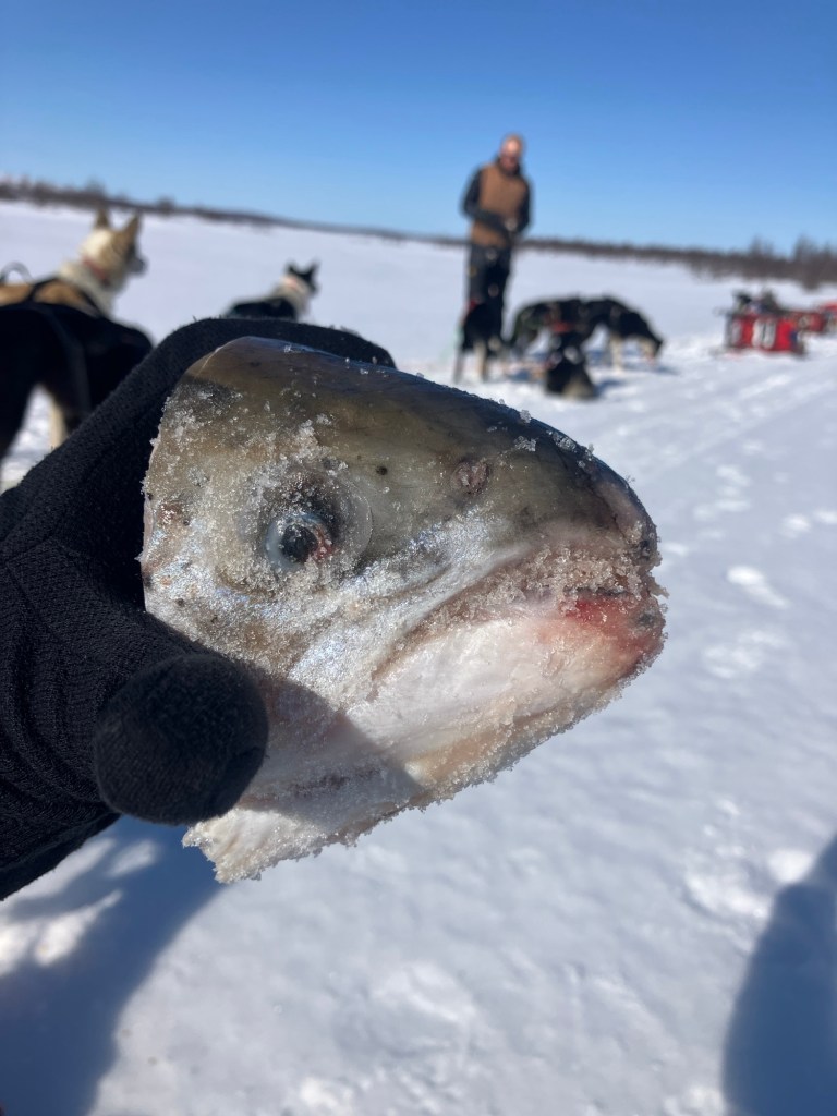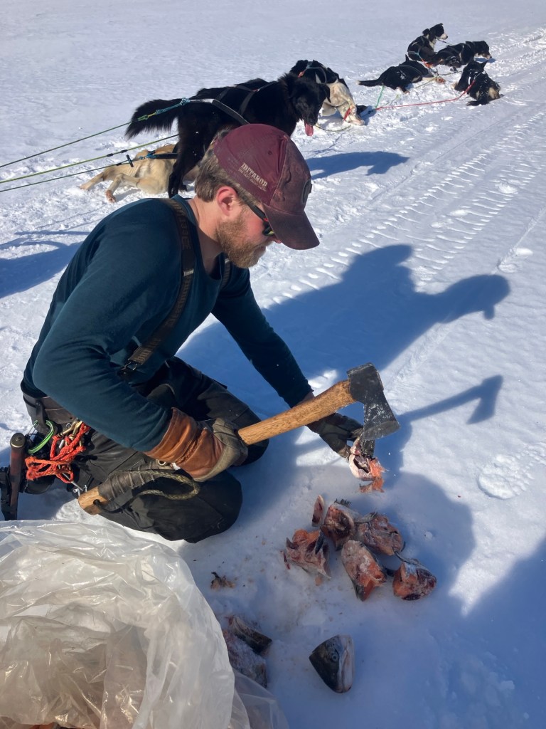 The dogs got a snack of frozen fresh salmon. Asbjörn hacked out chunks of fish – some of which would have cost a fortune in a supermarket back home!