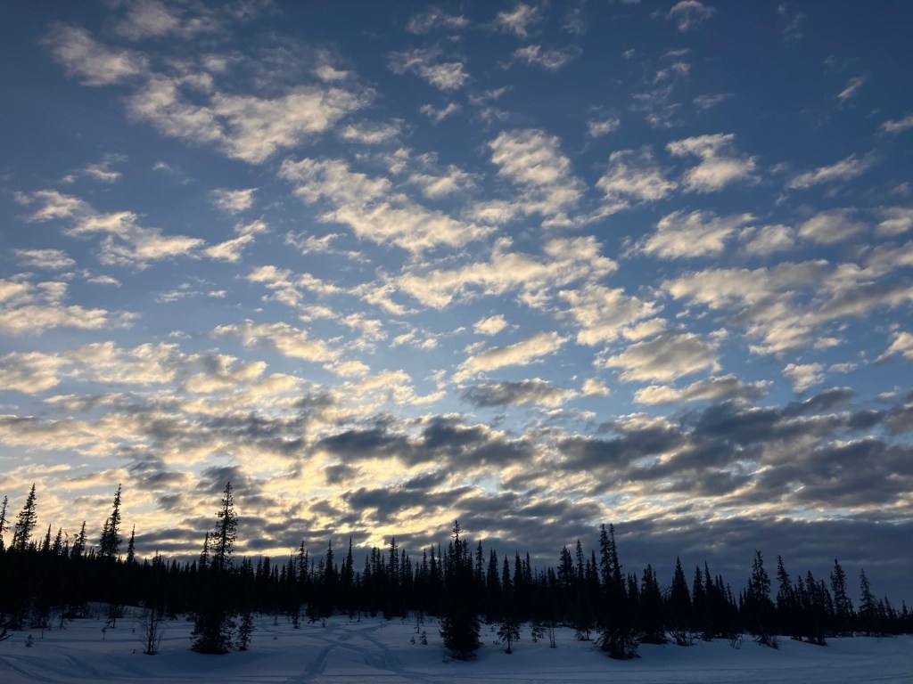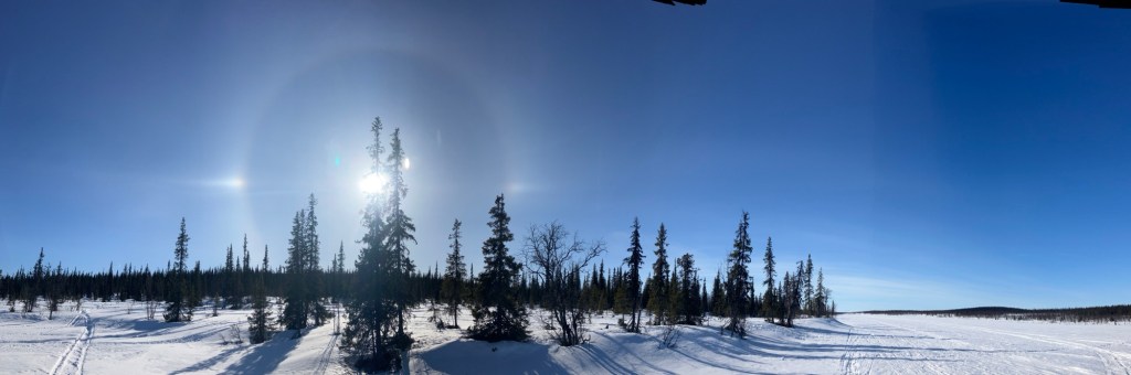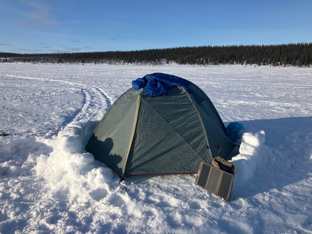 The scenery was wild and impressive. Today we saw only a couple of folk who had traveled by snow mobile to fish in one of the lakes we crossed.