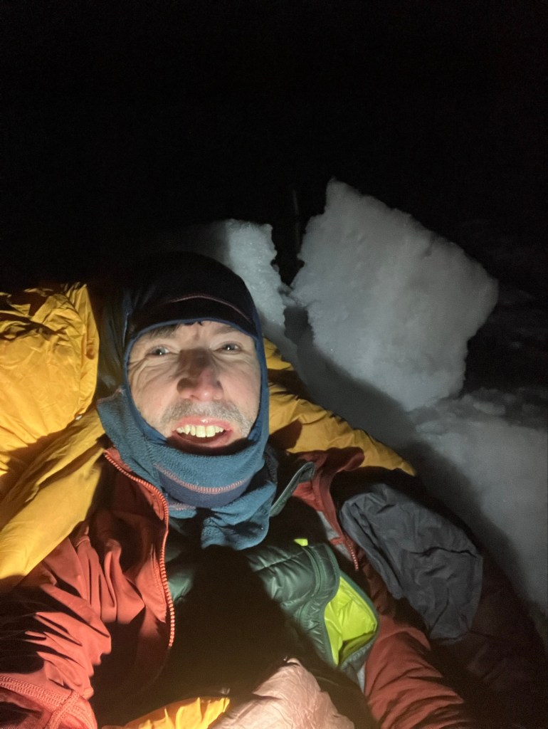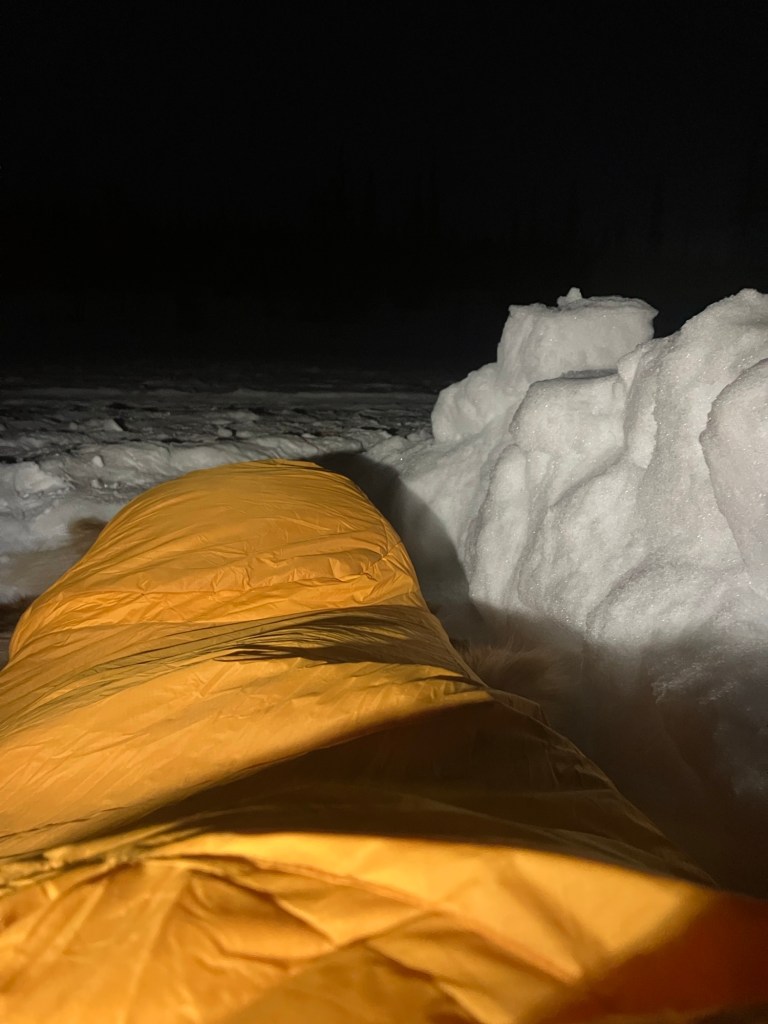 It had clouded over by night fall. As everyone climbed into their respective tents, I decided to Bivi out on the ice. I made a small walk to protect me from the breeze and snuggled into the enormous sleeping bag that Asbjorn had lent me. It was rated to -32°C so I figured I’d be okay!