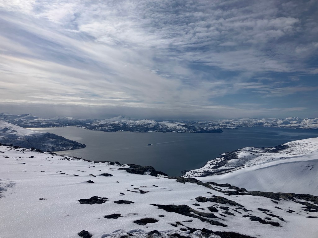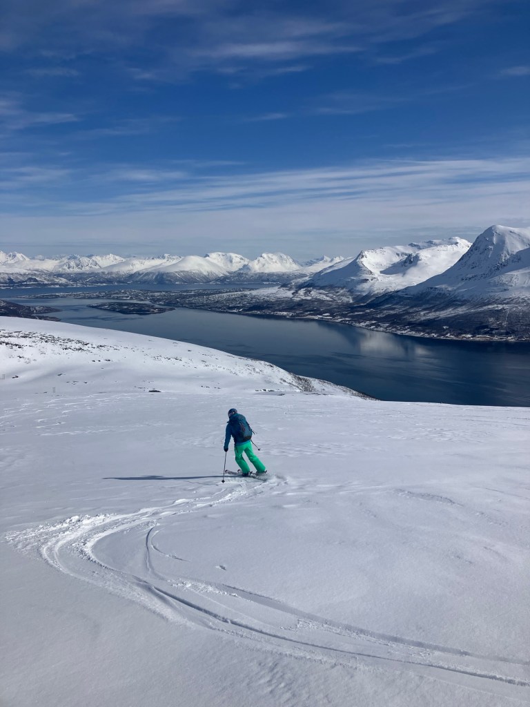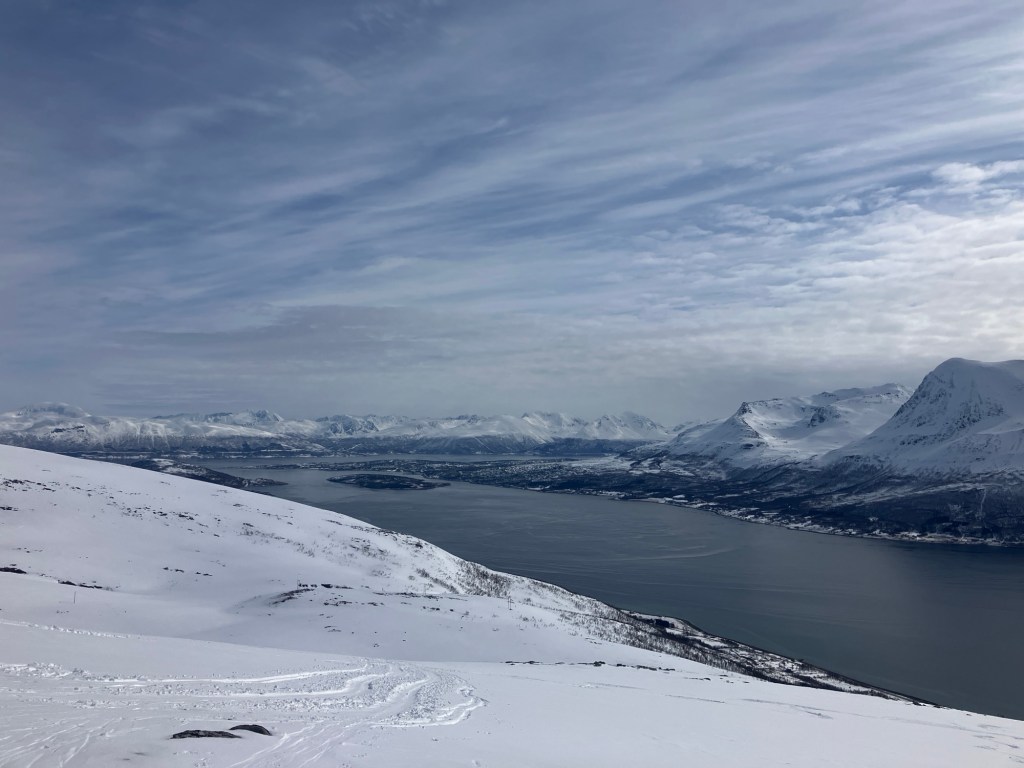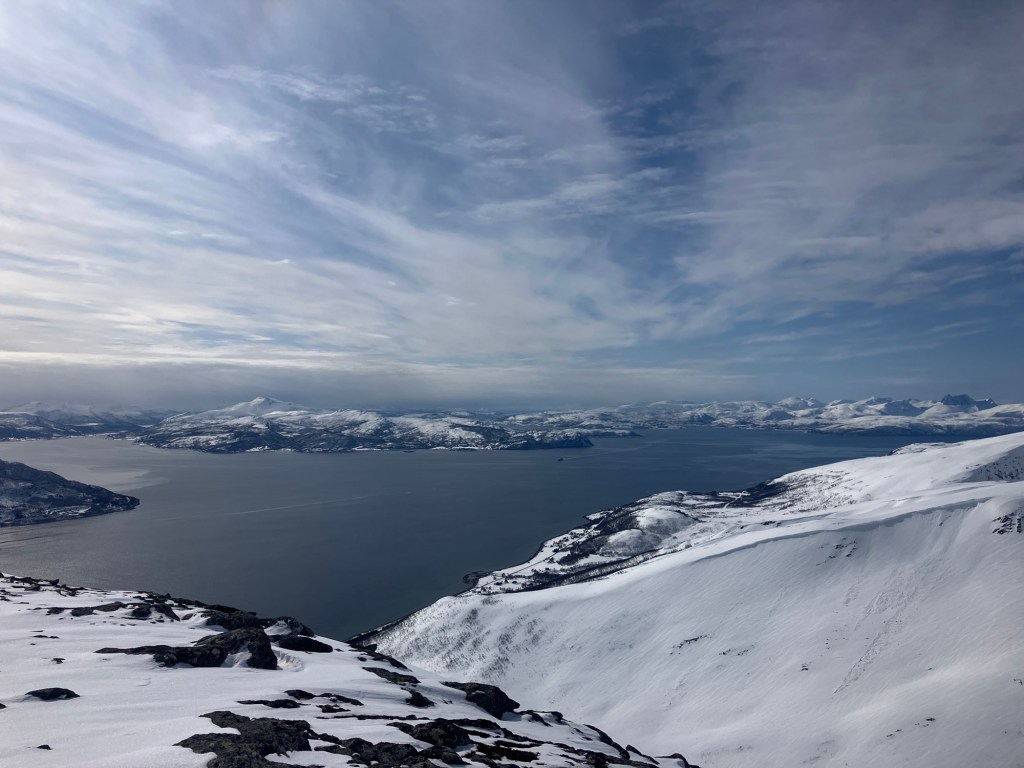 For a ‘change of skyline’, we drove around the fjord this morning to climb a peak called Gråtinden. It was a beautiful thirty minute drive, during which we saw only a handful of other vehicles. The scenery around here is just incredible. Everywhere you look there another even better vista. And to be able to park up by the water, lift your skis out of the boot of the car and climb a peak is even better than I had imagined.