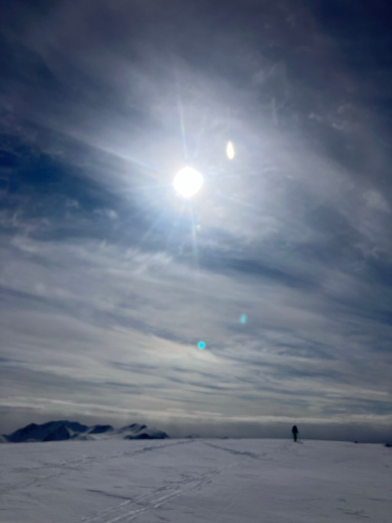 A few rocks marked the high point and we set over to them while a halo circled the sun.
