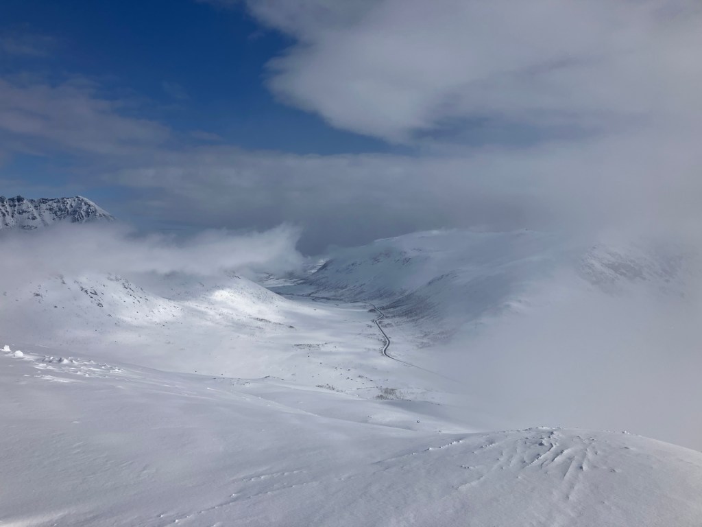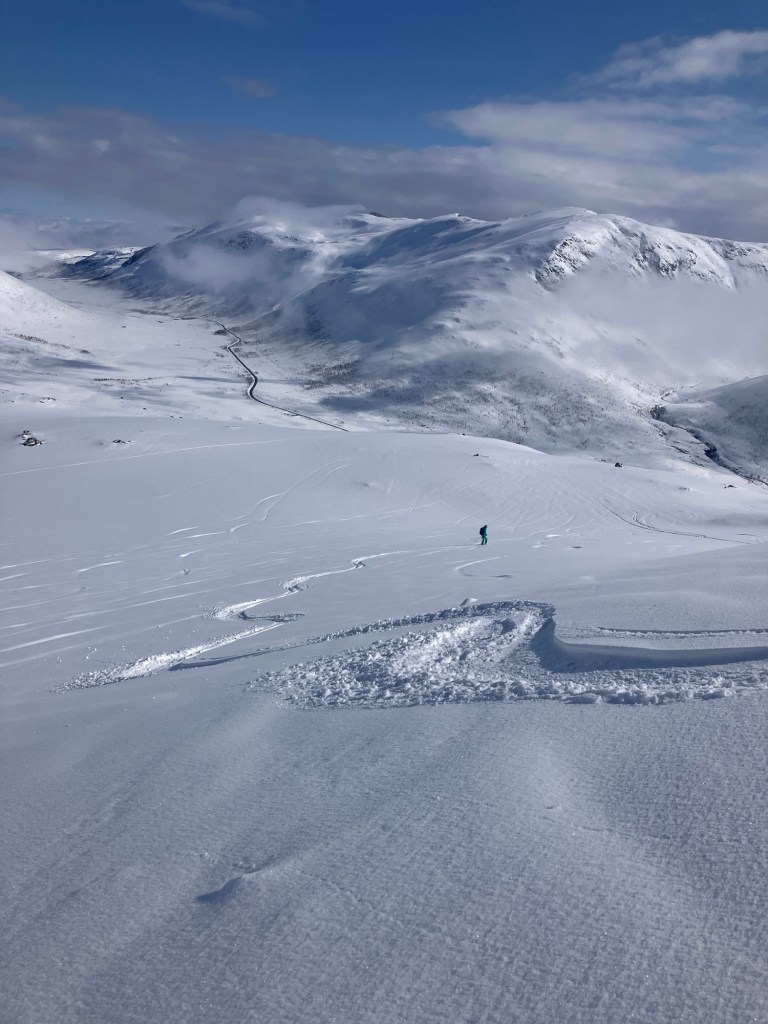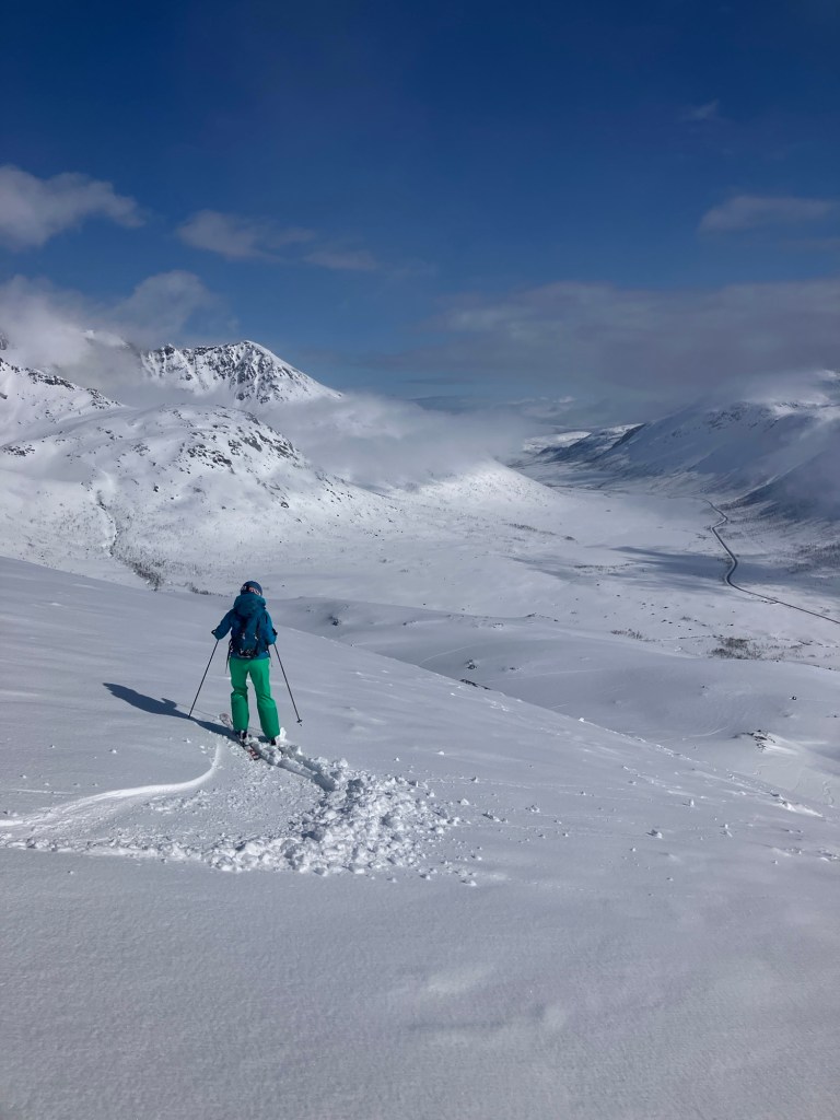 We chose a short objective, as we were tired, but also as Clare had to be ‘back in the office’ later in the afternoon. The few centimetres of fresh snow at the house, translated to 10 a 15cm of fresh snow higher up the mountains. Once again, we thanked our lucky starts for another Arctic powder day!