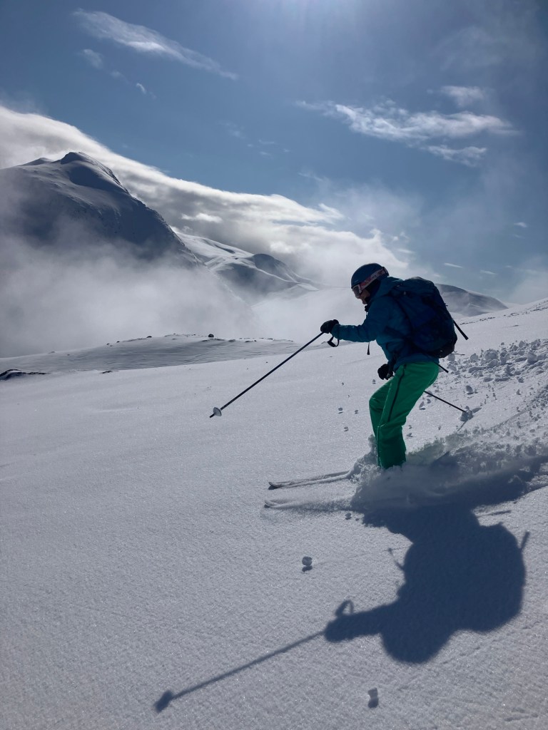 We waited for it to fully clear before clipping in our skis. We could see the next band of dark clouds approaching from out at sea, so took our opportunity to go…