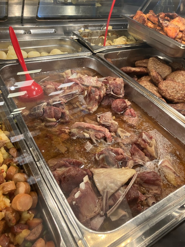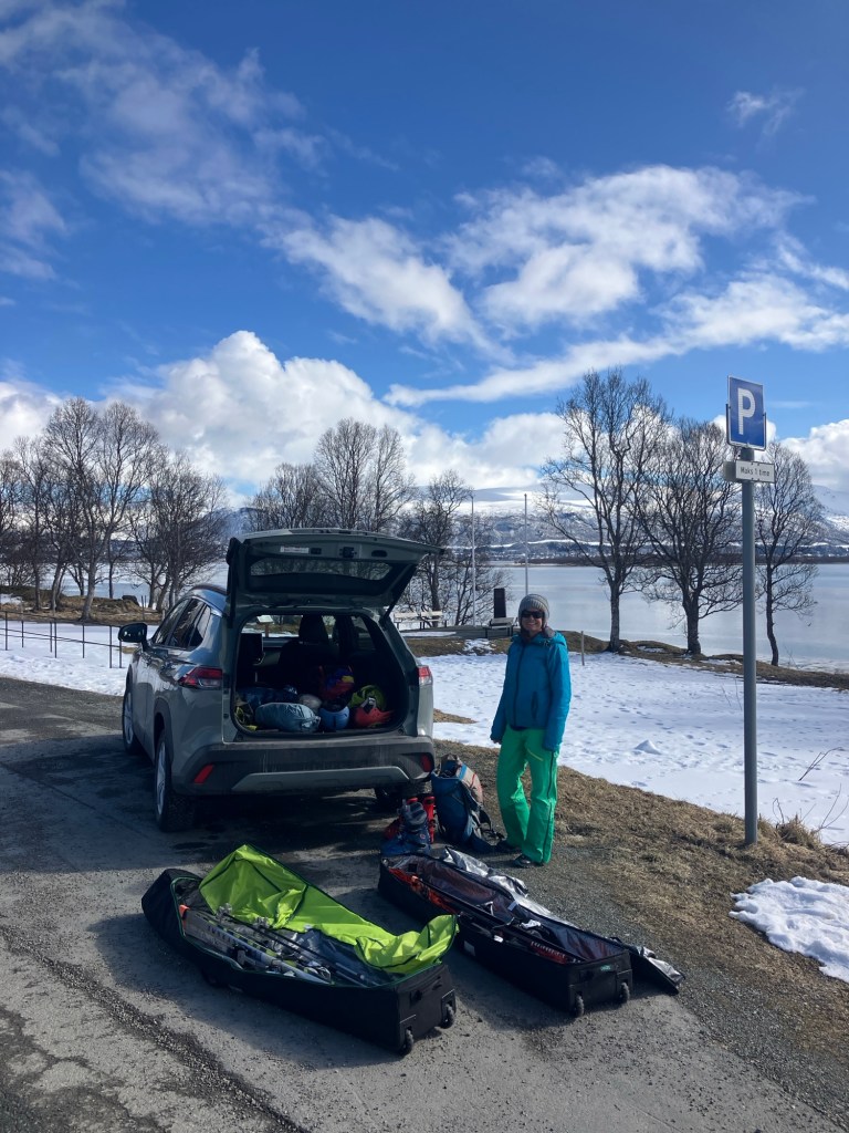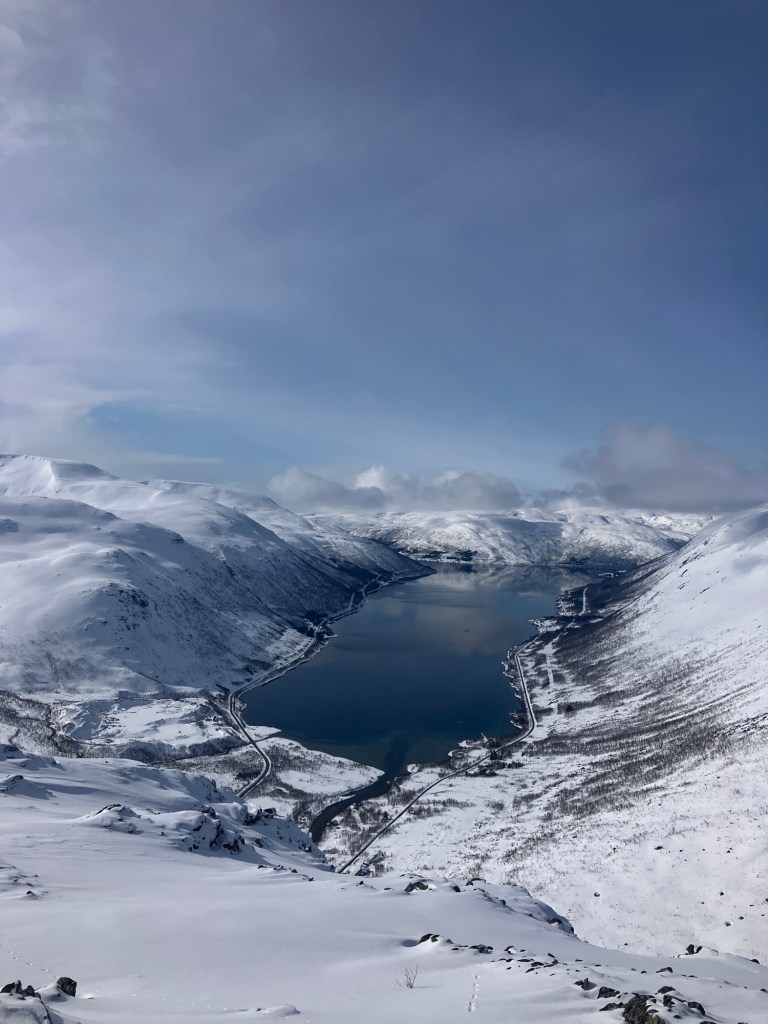 We had timed things perfectly, to get a late hot lunch at the amazing ‘Eide Handel’ buffet on the way. As we got there another blizzard blew through, so we were glad to have been able to sort the gear in the sun! There was an option of reminder stew, but the bones put me off so we both had a huge slab of salmon with potatoes. Along with a couple of coffees, it only cost £17 in total as was delicious! We left feeling well set up for some travel time…