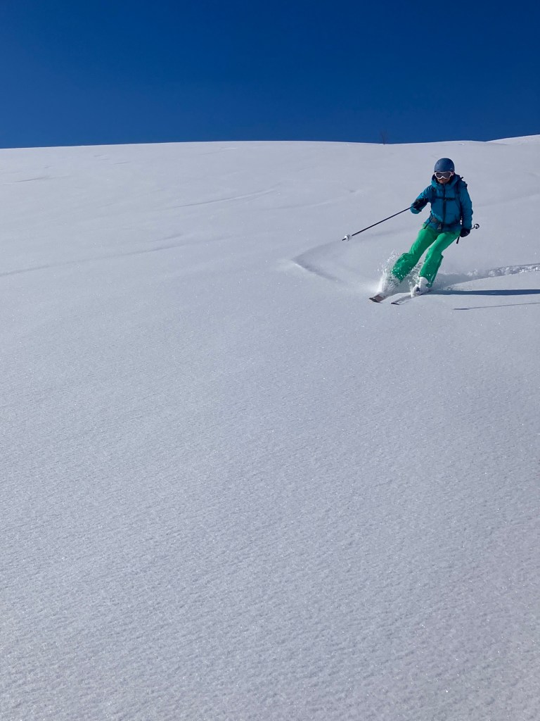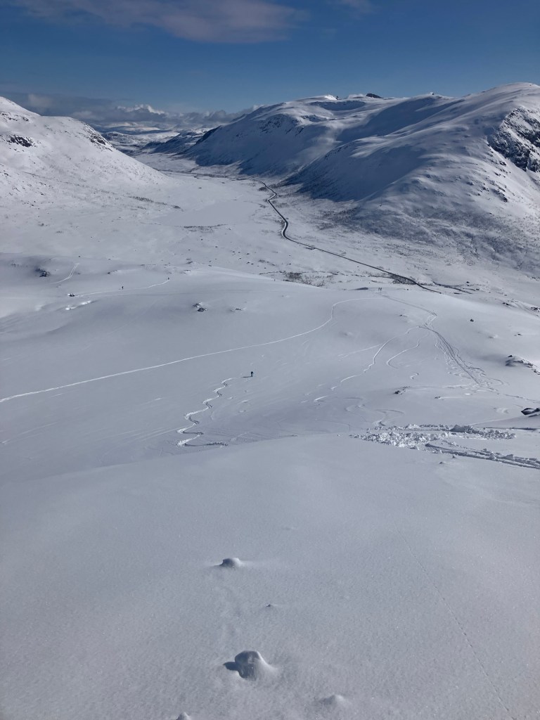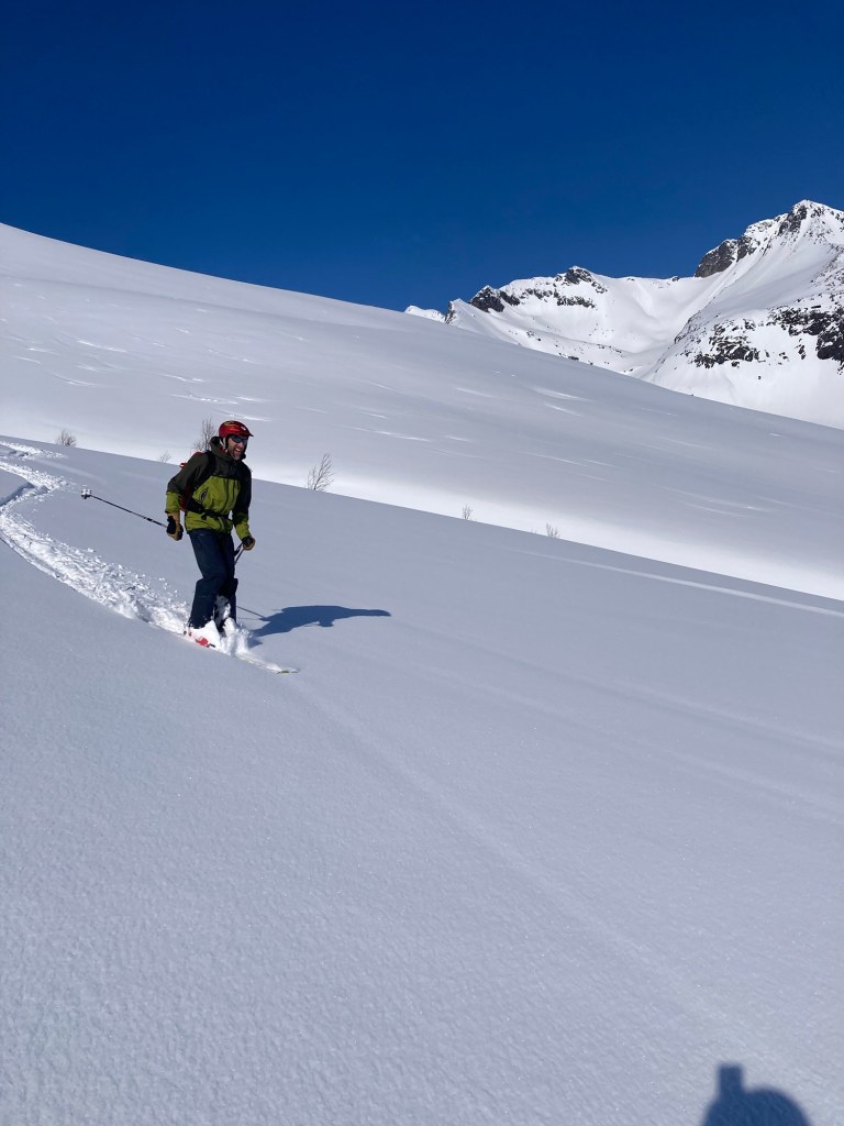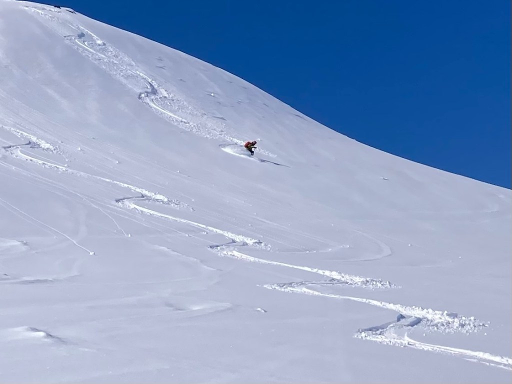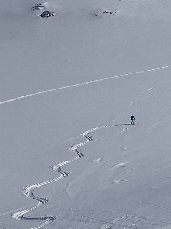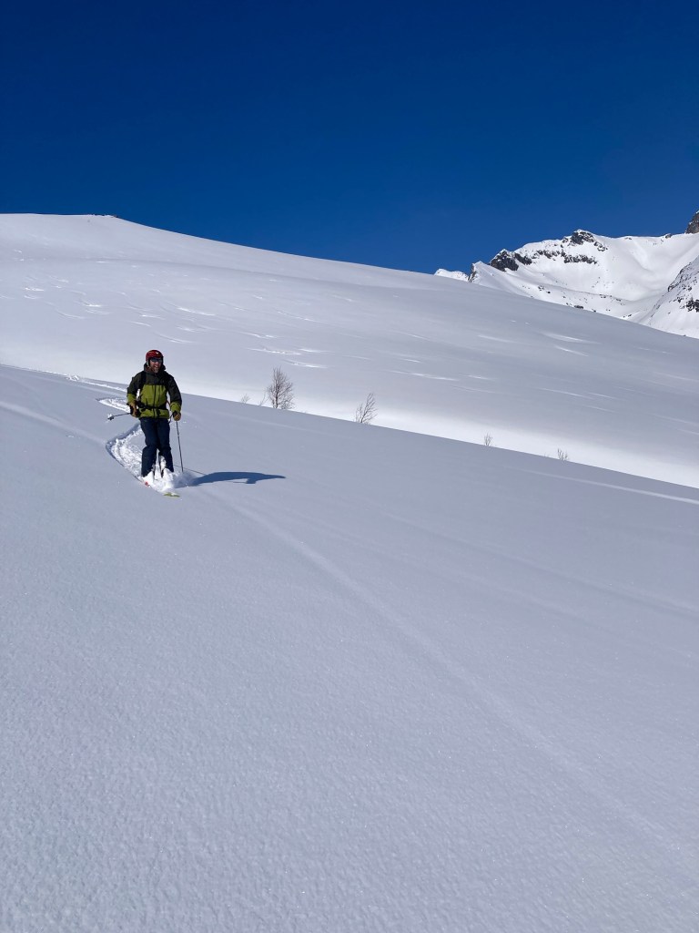 As hoped, the ski down was one of our best! We revelled in putting in some fresh tracks as we glided easily and happily back to the valley by ourselves.