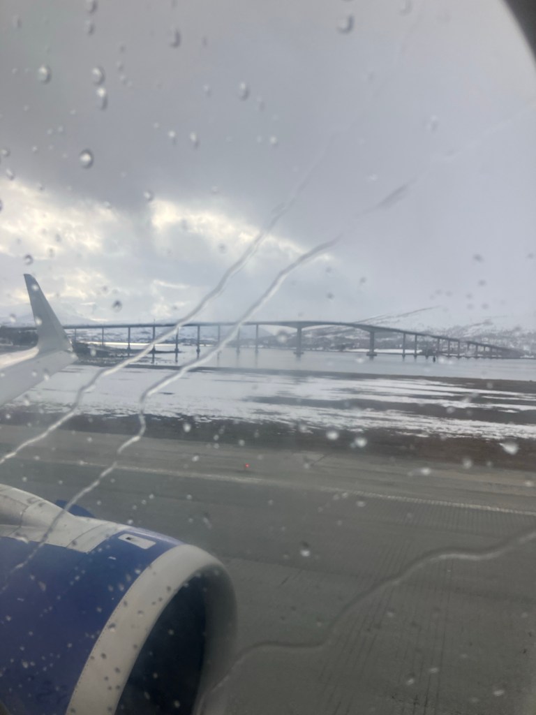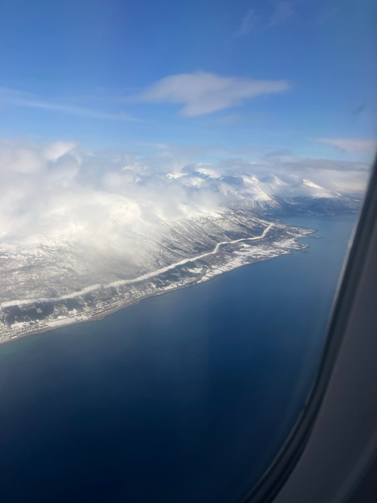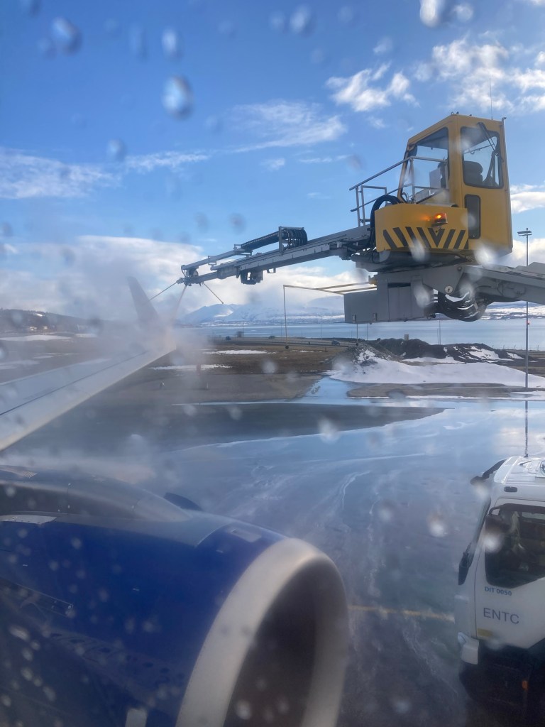 It was a further ten minutes to the airport, which is small enough to park right outside the front door. On the way we passed a couple of herds of reindeer down by the waters edge! With car keys returned the keys and skis checked in, we pretty much went straight to the plane (which needed de-icing before we could take off!).
