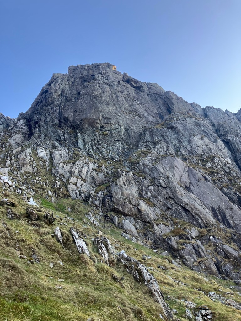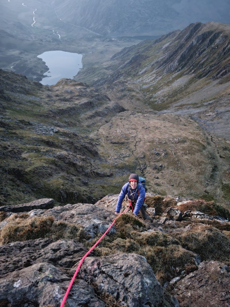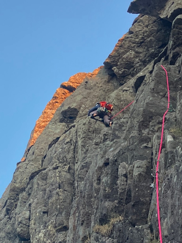 The belay was terrific. A hanging stance at the end of a small grassy ledge. Below us the crag dropped away for what felt like hundreds metres, giving us some sensational exposure. On another day, I’d have taken a photo to soak up the. View and experience, but instead we made a ‘formula one’ style rapid change over, sorted the gear and re-racked the ropes.