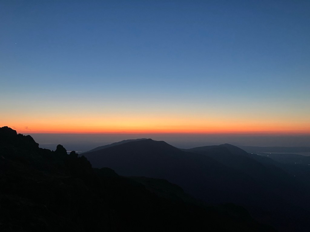 Coming off the dark vertical wall and onto the flat of the summit was a huge relief and a super moment as the last of the light glowed in the distance. We were buzzing with delight!