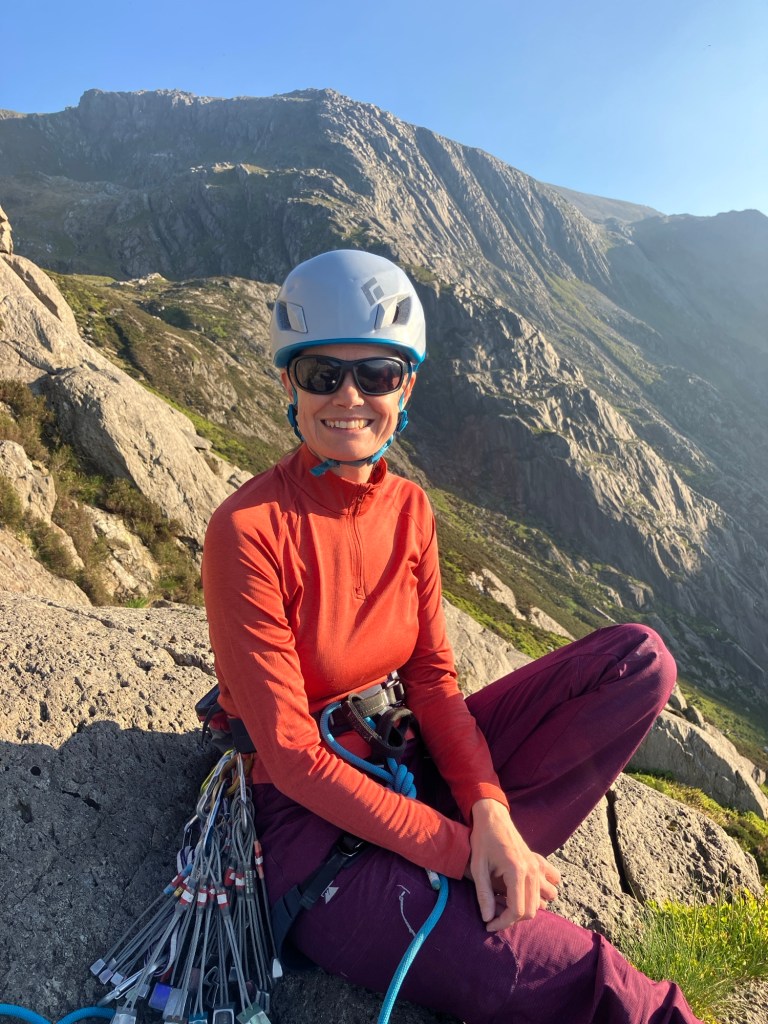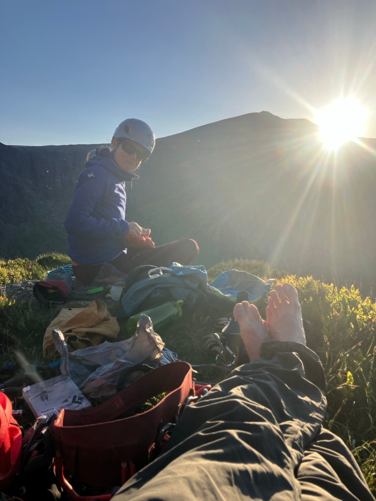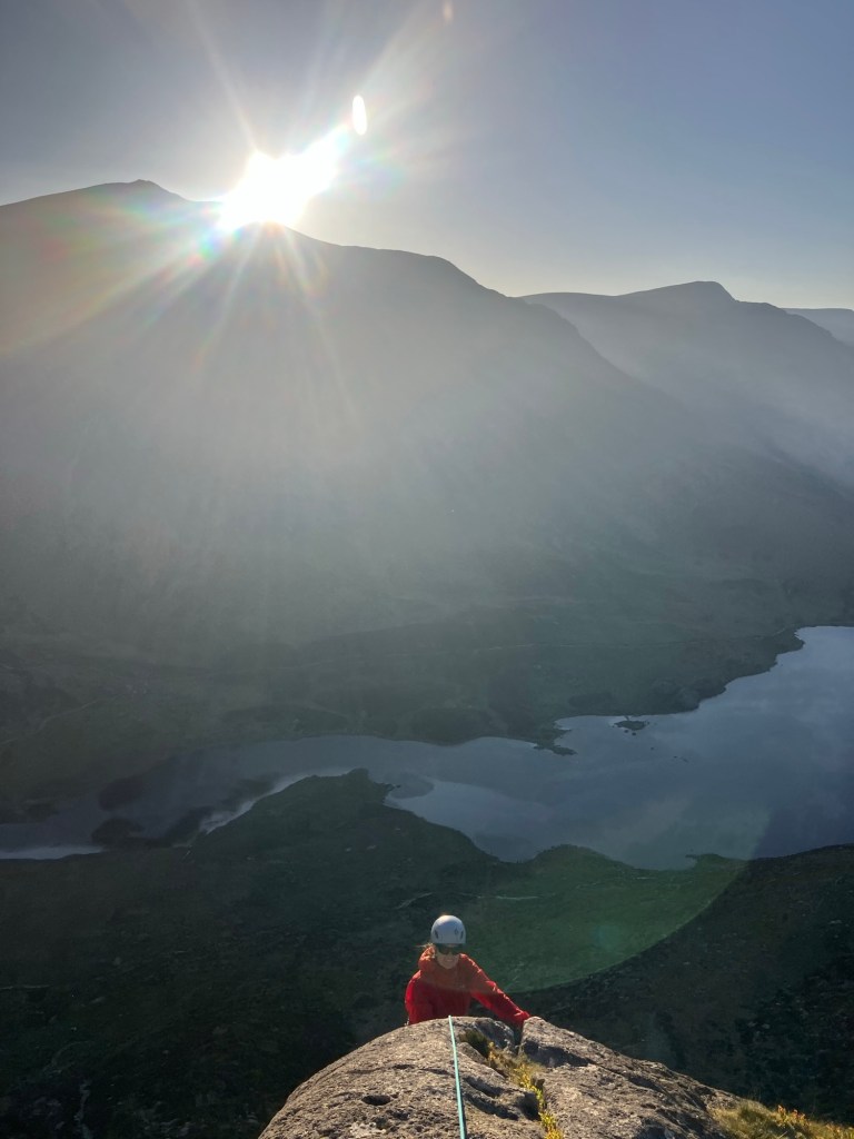 Clare was making the final moves onto the top of the ridge, when the sun hit the horizon! Very satisfying timing!