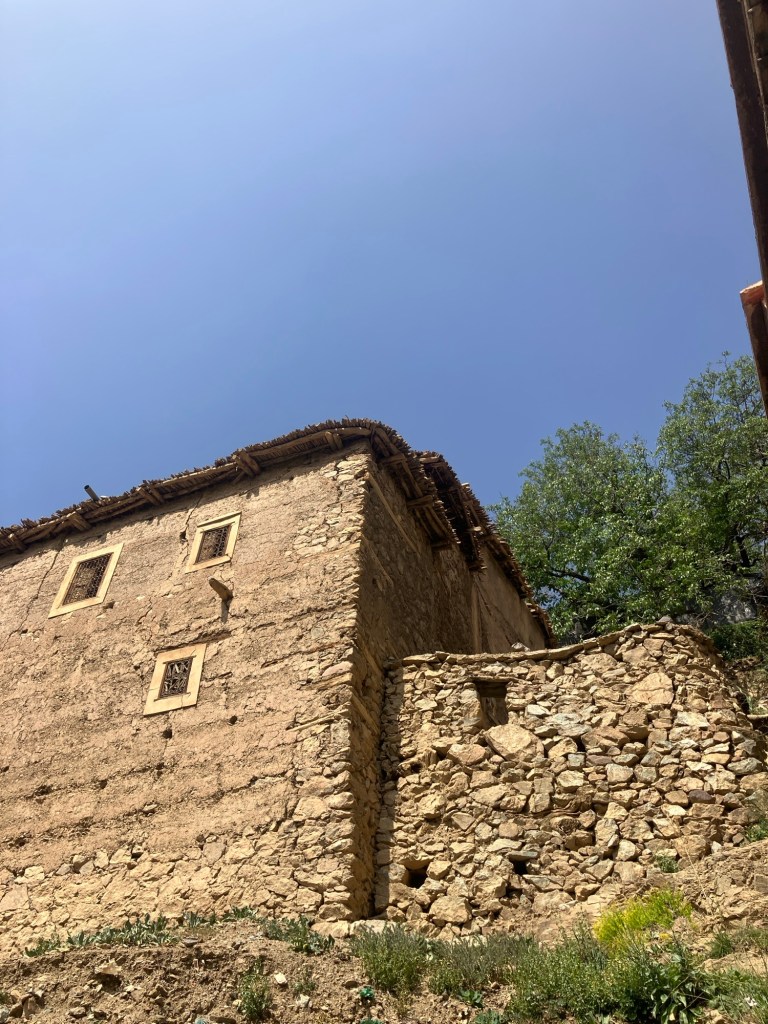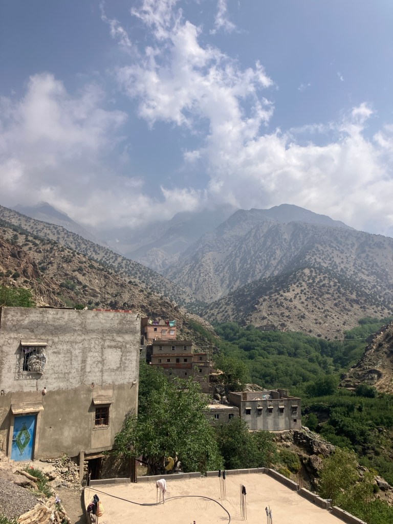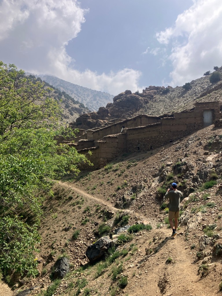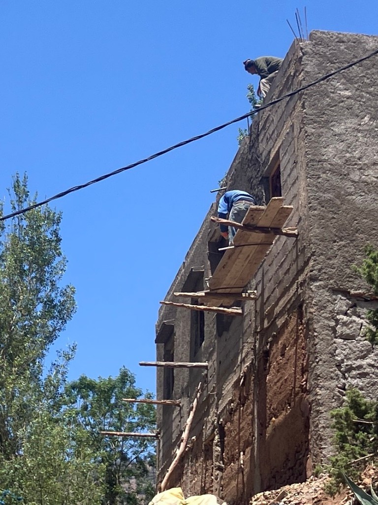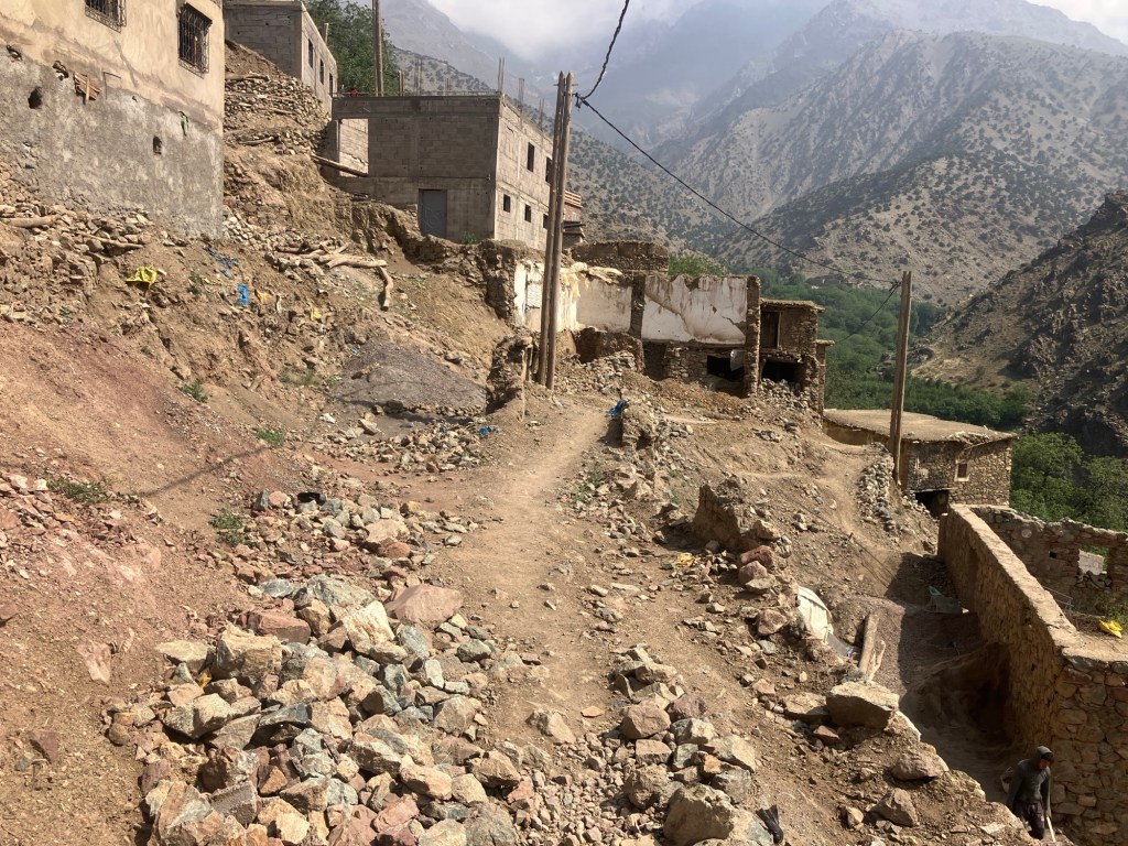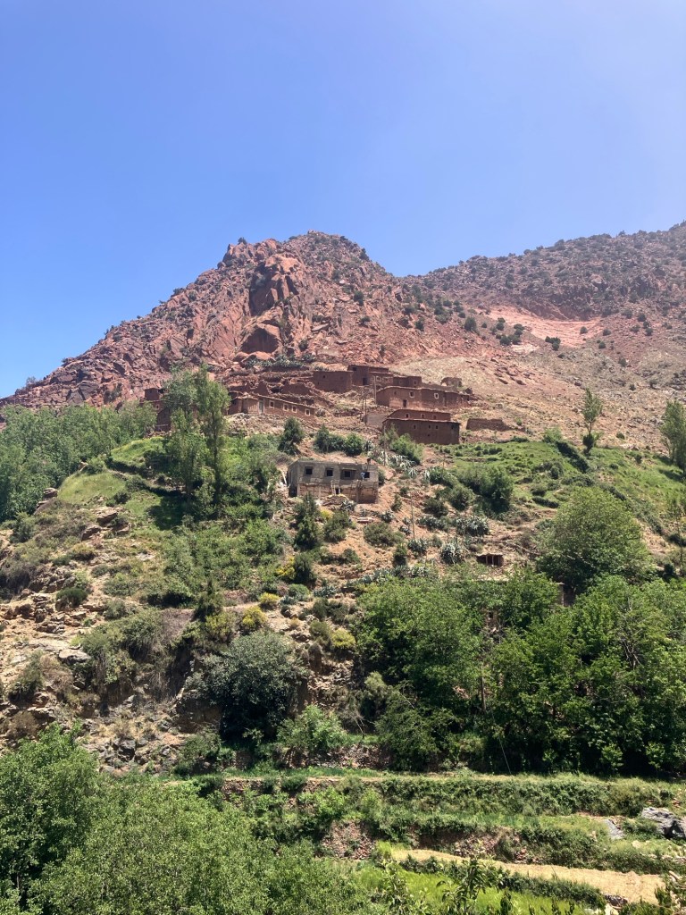 It was a steep scree hike down to the village where we are now. Tizi Oussem. The village is currently being rebuilt after the 2023 earthquake. Some of the houses are still half hanging from the hillsides. It was quite an eye opener to see the destruction.