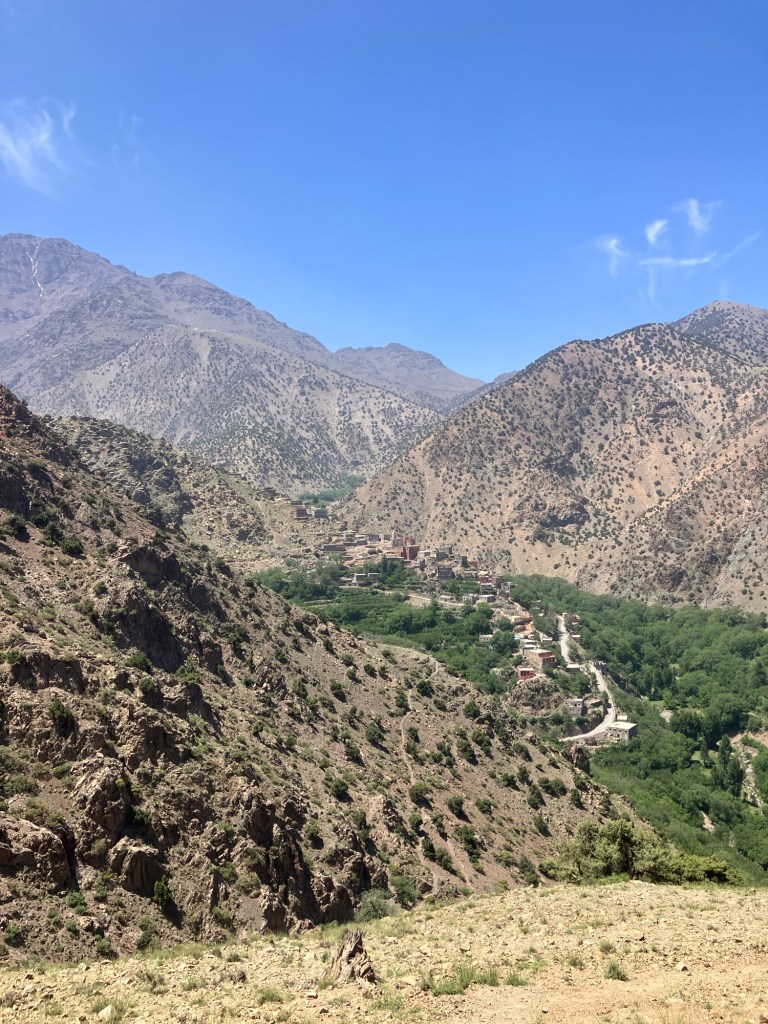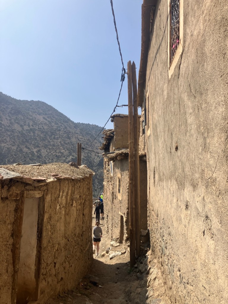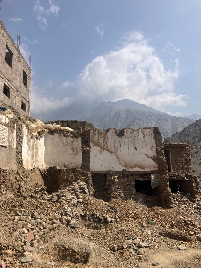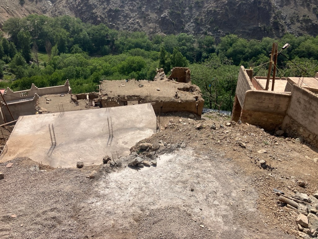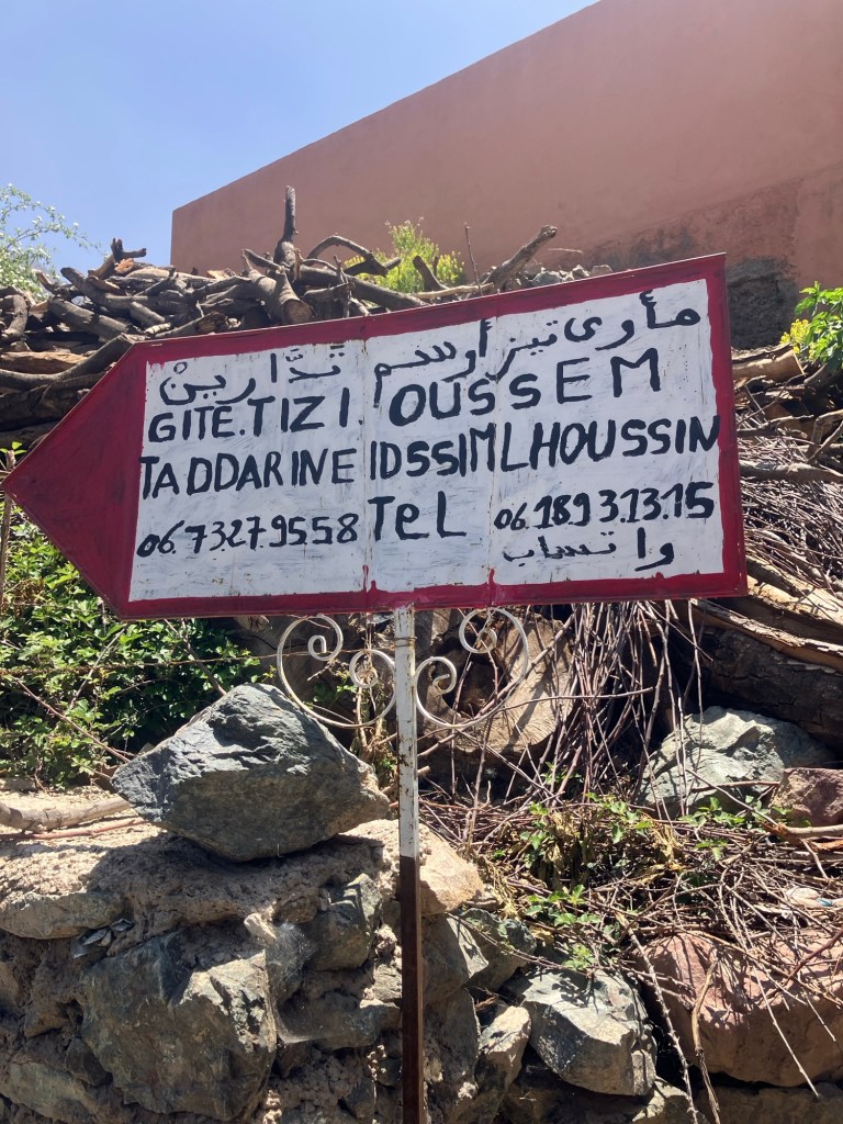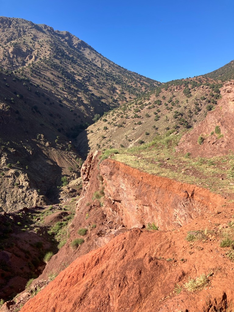 It was a steep scree hike down to the village where we are now. Tizi Oussem. The village is currently being rebuilt after the 2023 earthquake. Some of the houses are still half hanging from the hillsides. It was quite an eye opener to see the destruction.