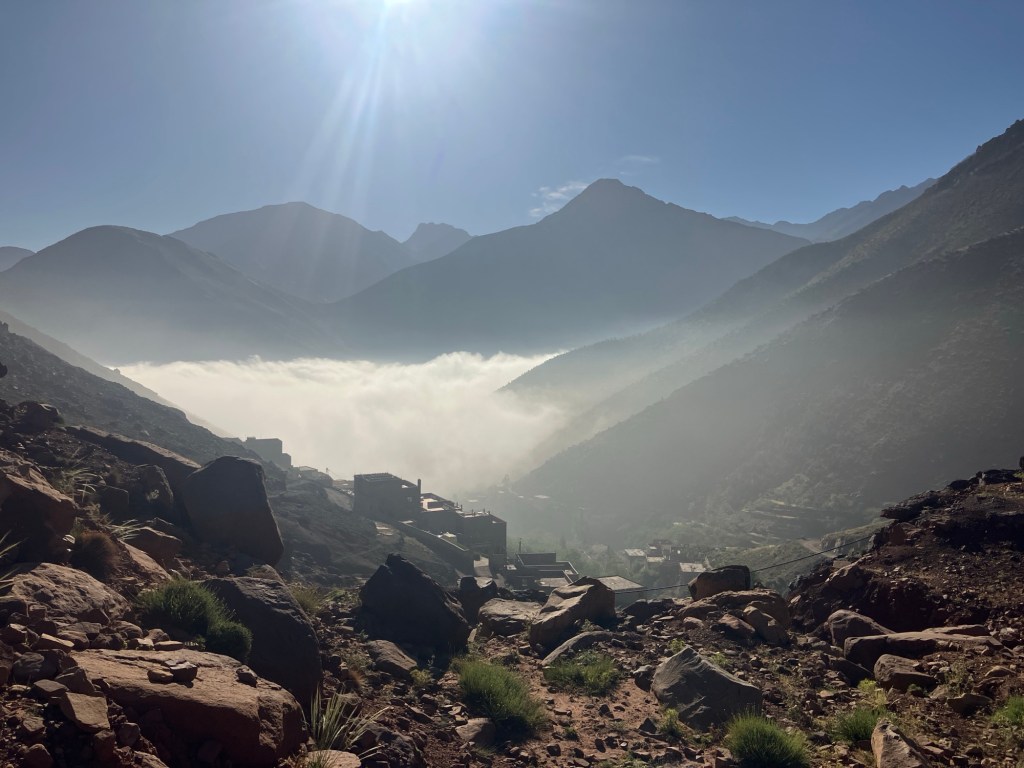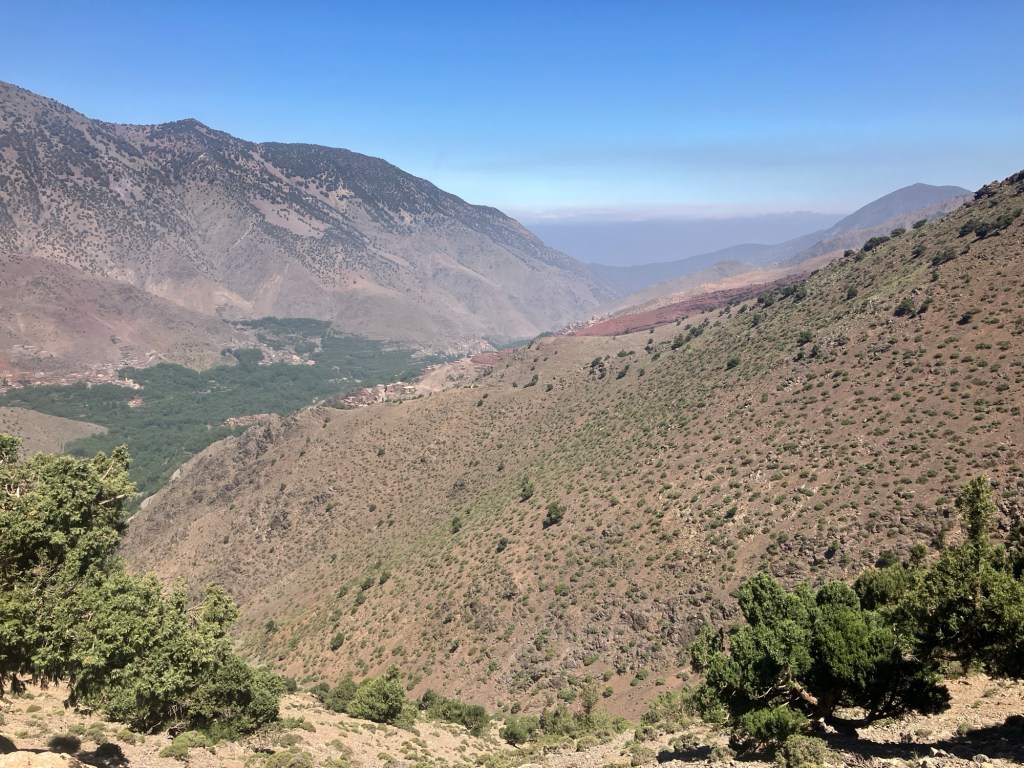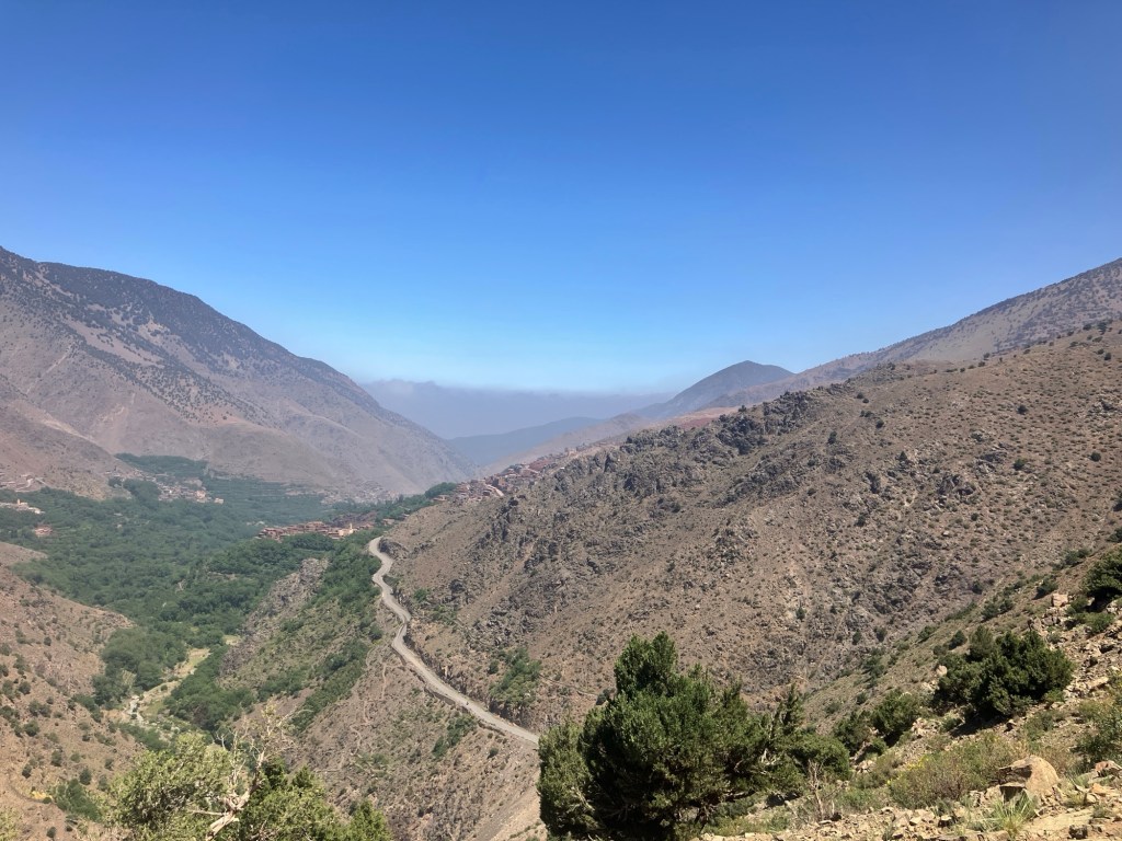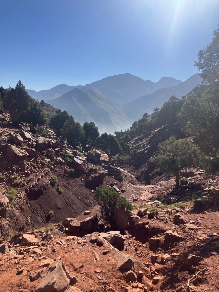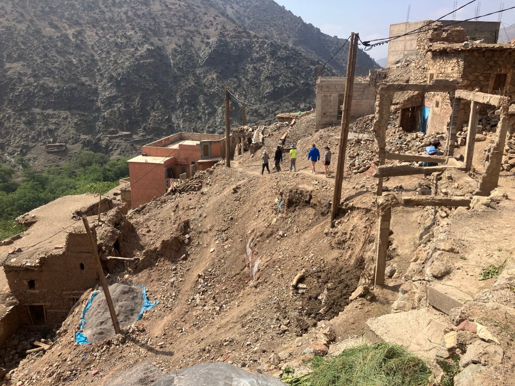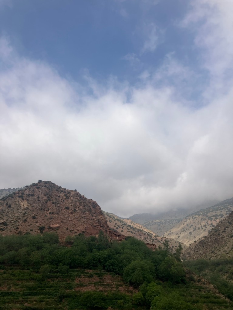 It was a steep scree hike down to the village where we are now. Tizi Oussem. The village is currently being rebuilt after the 2023 earthquake. Some of the houses are still half hanging from the hillsides. It was quite an eye opener to see the destruction.