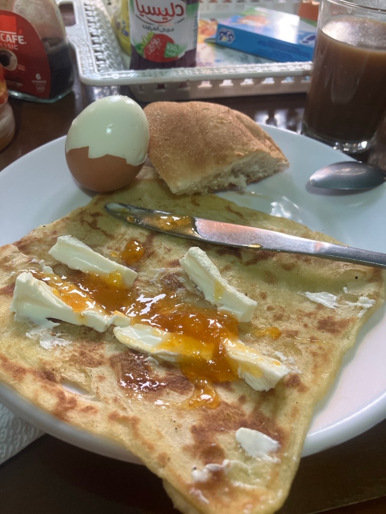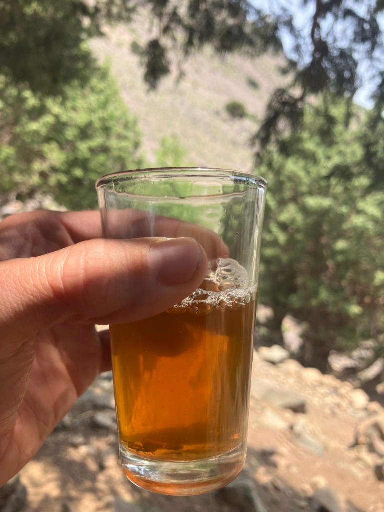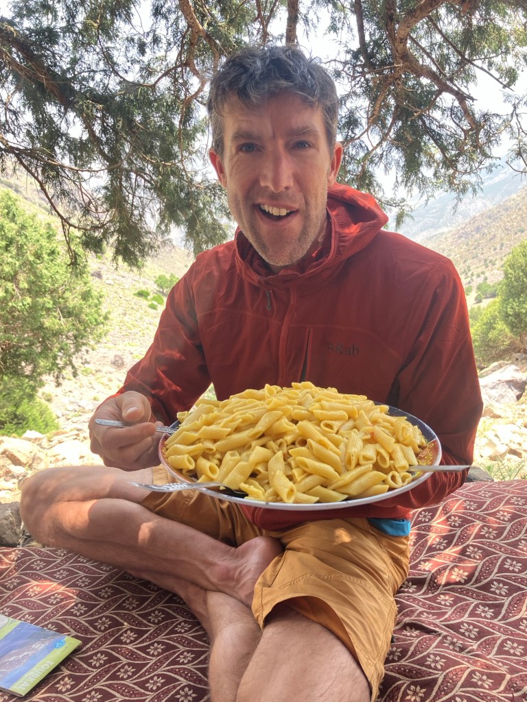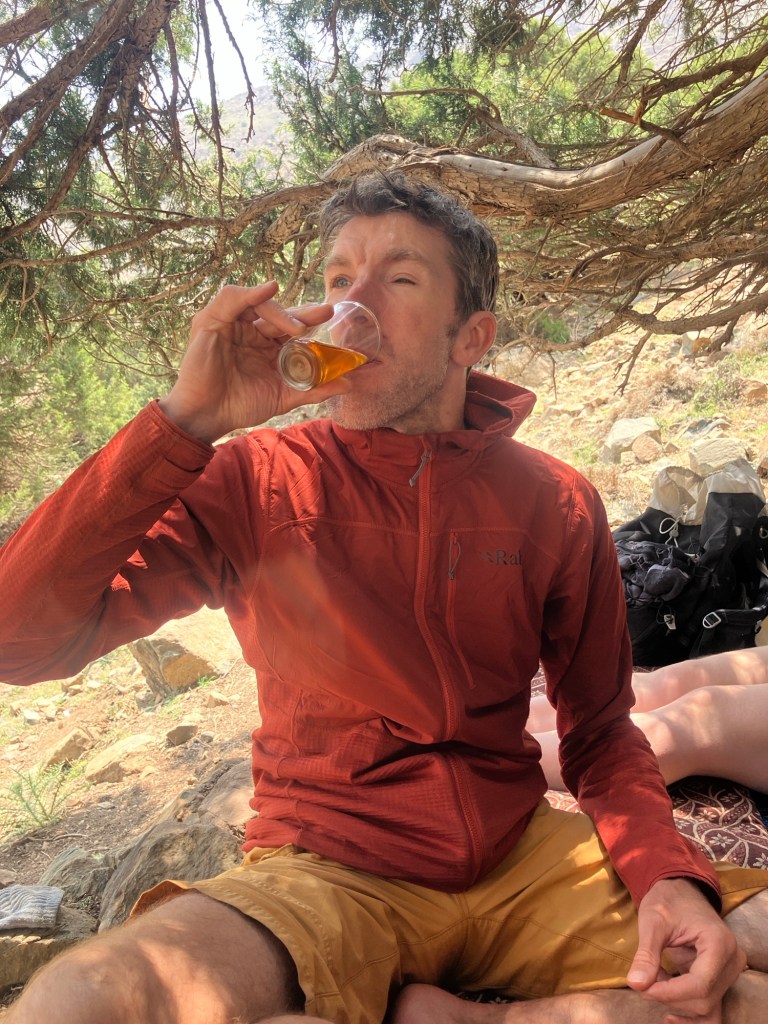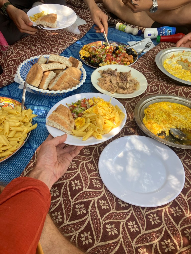 On the far side, we enjoyed our best lunch yet! A flat shady area, mint tea and a huge feed including a massive monster omelette!