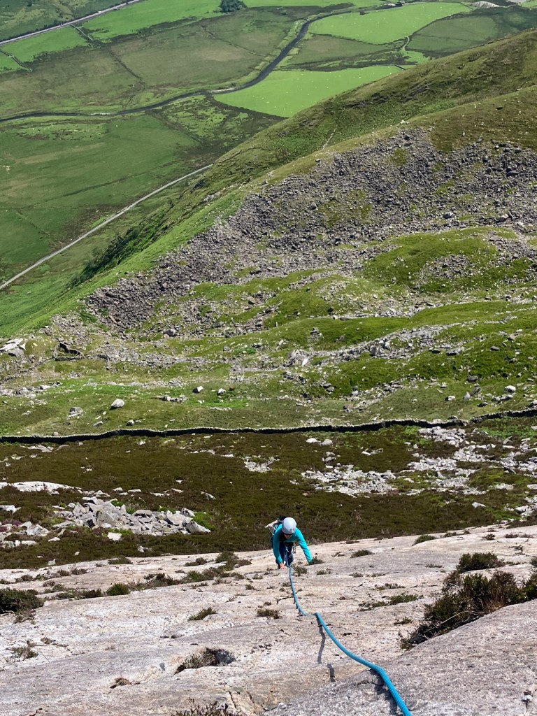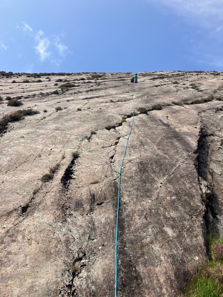 Two long pitches of mega slab climbing and just enough gear to not be scary. Pure enjoyment.