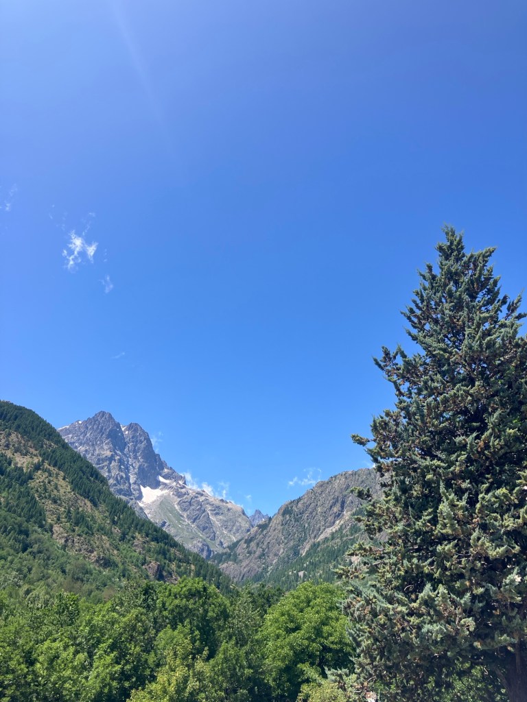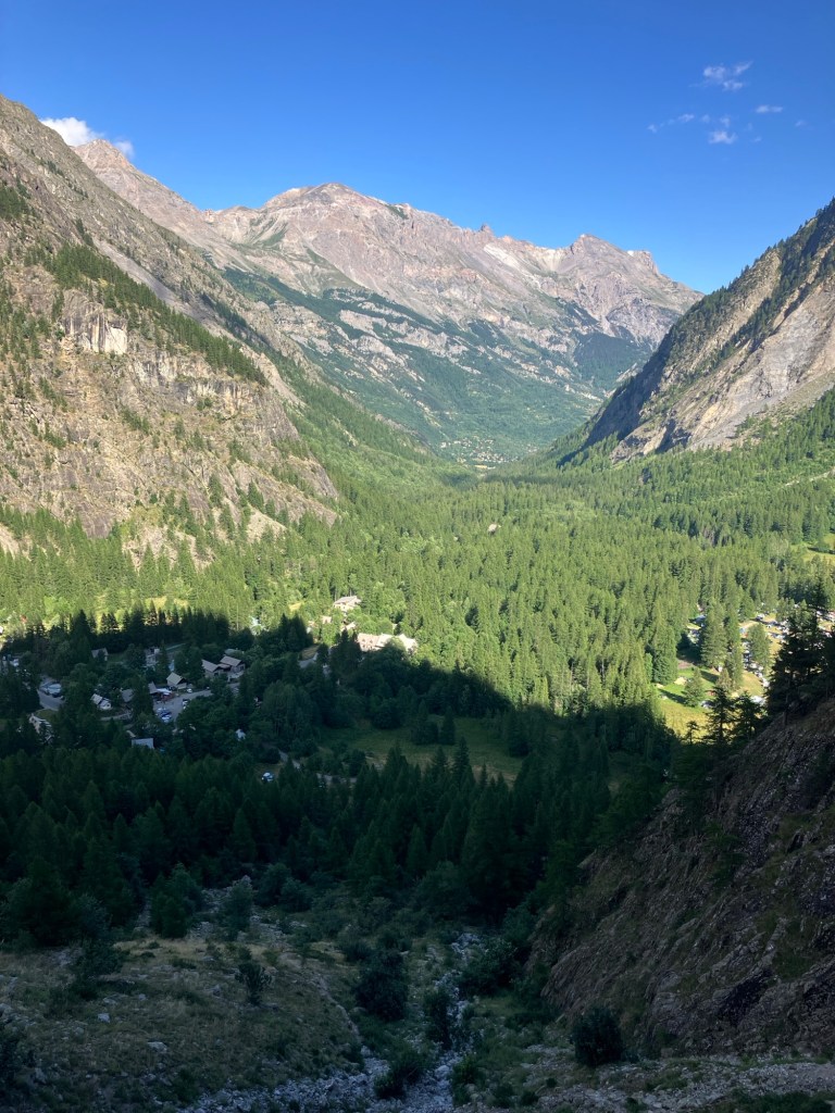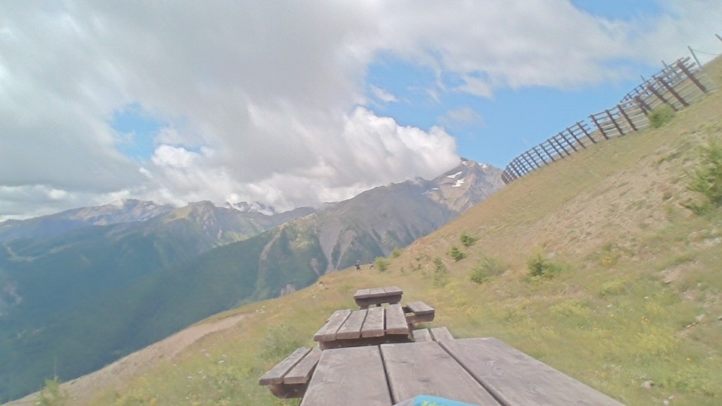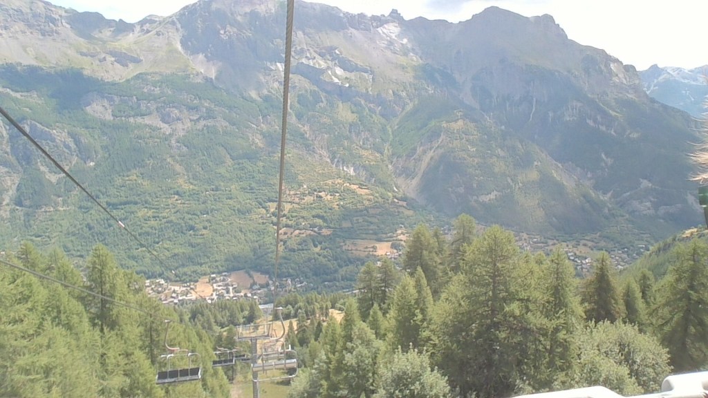 However, before reaching the bakers, I noticed that the local chair lift seemed to be running, so detoured over to the ticket cabin to get a timetable and price list. As it turned out, today is the first day of the summer opening and I was told that I could get a free ride today if I fancied it! I decided did rather! So, next thing I know, I’m slowly drifting above the bakers, then tree tops all the way up to 2300m! I didn’t have my camera with me, but realised at the top that I did have my laptop, so here are a few very low quality snaps from high above Pelvoux village…