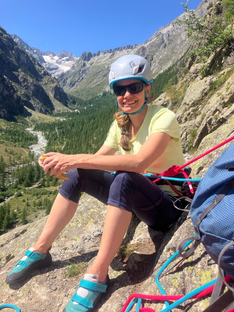 At the top of the climb, we sat a while soaking up the view and the buzz of completing the difficulties. We had a little picnic with us, so clipped to the anchors and hung out for a while in the warmth of the sunshine, with no need to go anywhere fast.
