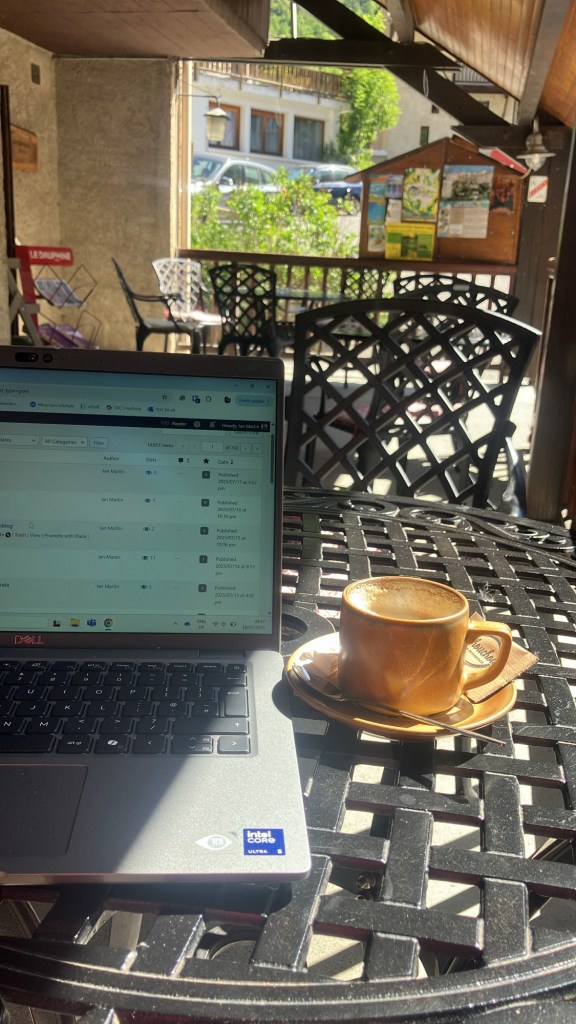 Clare has had a very busy period of work, so while she was ‘on calls’, I decamped across the road, to the very pleasant surroundings of the shady balcony terrace of the Hotel Glacier Blanc.