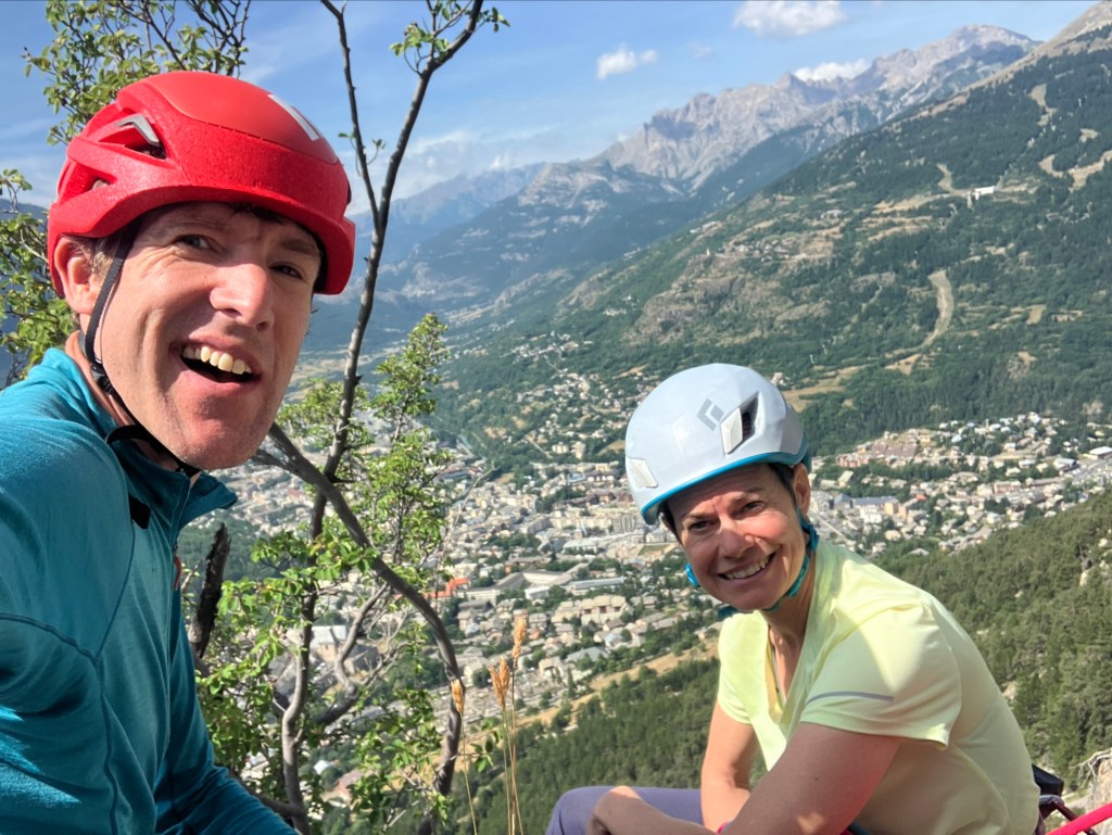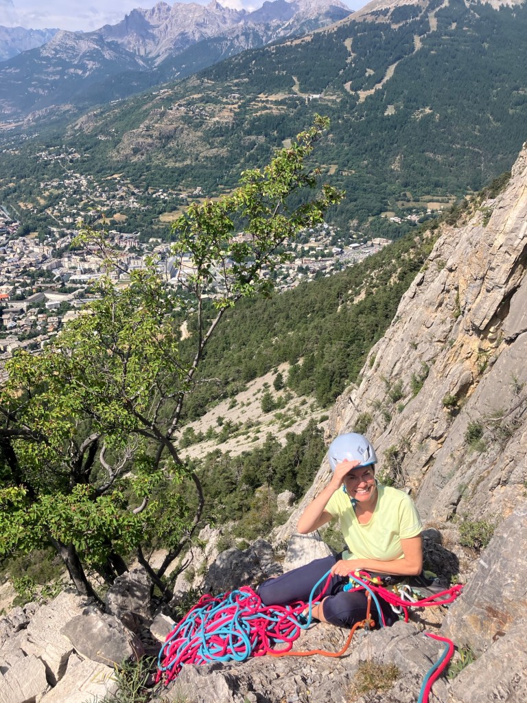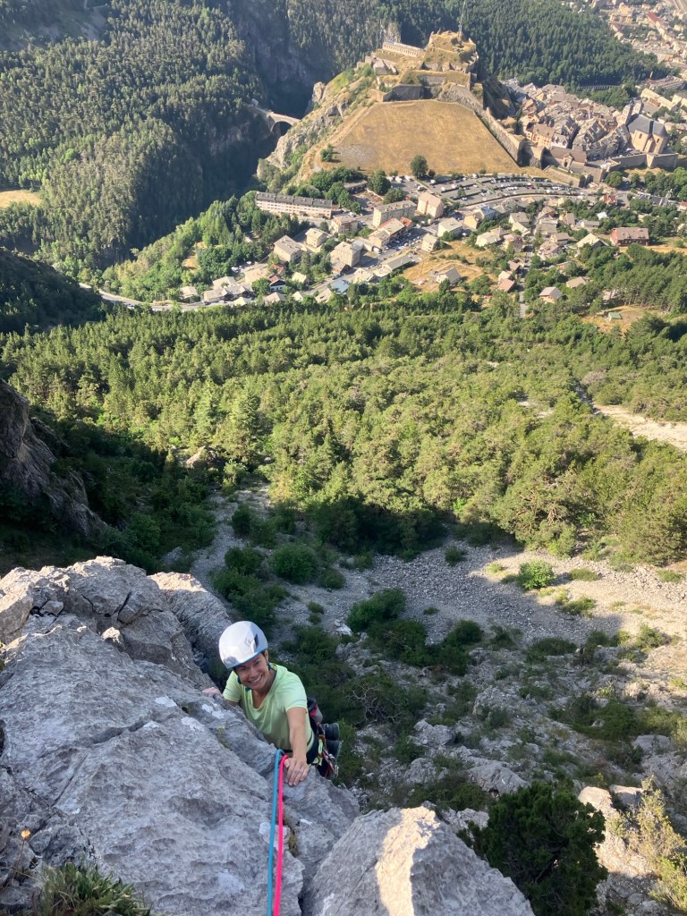To take advantage of the slight dip in the temperatures, we were up and out early to try a climb about the town of Briancon. I’d heard about the Pilier Gris for a while and had previously decided that it would be too hot/busy to climb at this time of year, but with a cooler morning forecast, if we were quick, we hoped to get up and down before the sun blasted it too much. The view from the base of the cliffs over the old town and fortress was worth the early alarm call and steep hike to it’s base.