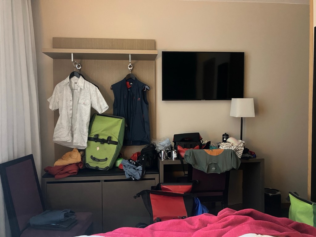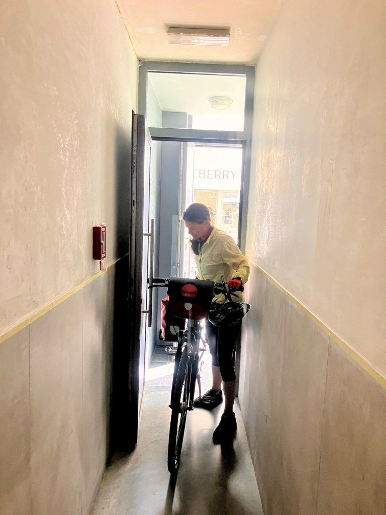 Luckily for us, our AirBnB host had said we could check in at 15:00, so we headed straight to the apartment. It’s on the edge of the centre and just off a busy road. The owner had said we were fine to keep our bikes inside, but the hall way was only just wide enough to squeeze in!
