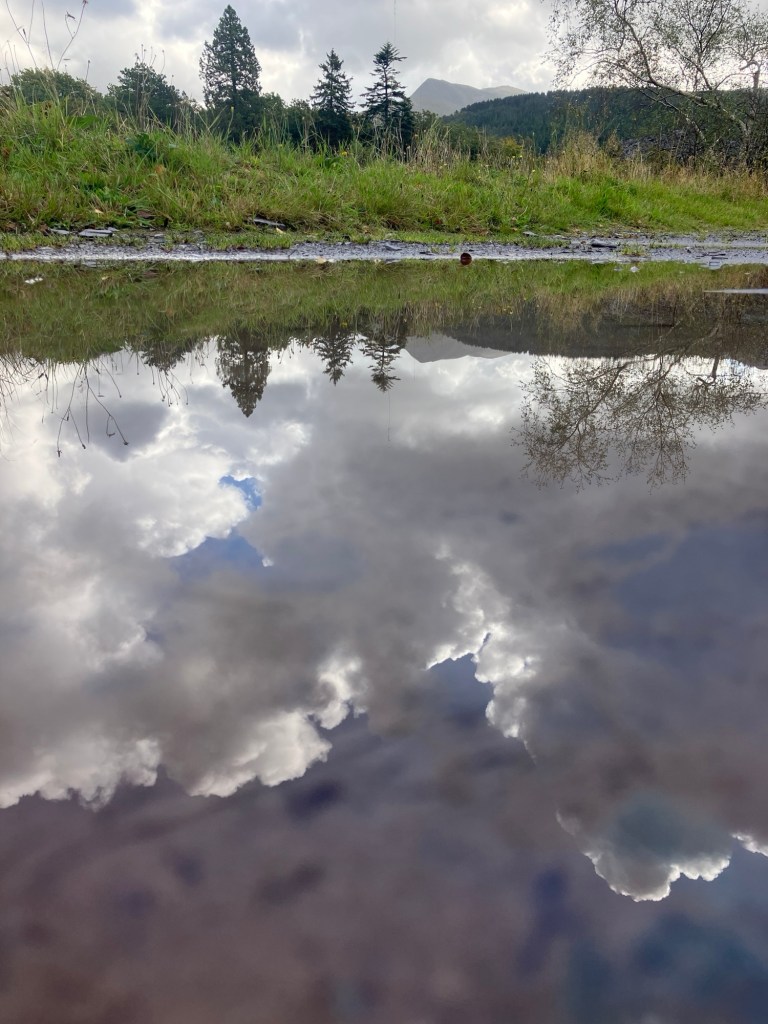 While Clare was coaching in the morning, I took a walk from The Cottage. The rain and wind of the night had ceased and there were some good reflections in the puddles on the track. The mountains were still looking wet and windy, so heading up high held little appeal.