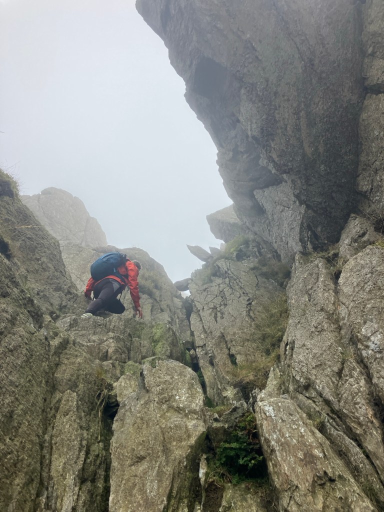 Clouds were ‘lingering’ in the air, but there was barely a breath of wind, which gave a rather spooky atmosphere as we entered ‘Sinister Gully’ at the base of the route, just as the clouds fully descended.