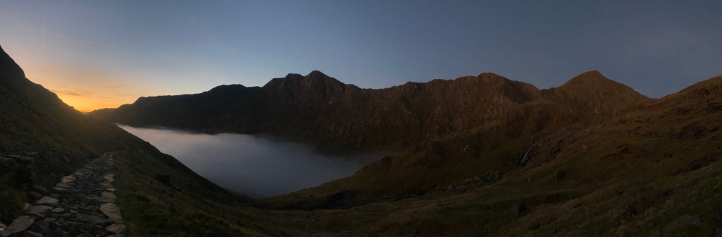 The mist and clouds were so thick as I climbed up the Pass and onto the Miners track, that the reflections from my headtorch meant that visability was only a few metres (like when you put full beams on, in the car in thick fog). It was actually easier to have no headtorch and let the faint moonlight guide me. I caught up the group around Llyn Llydaw and soon after a glow of colour appeared in the east.