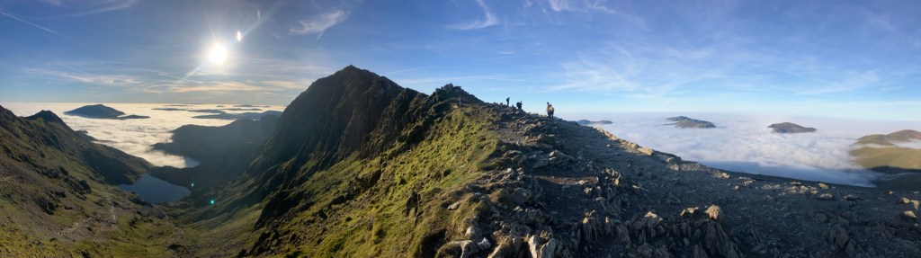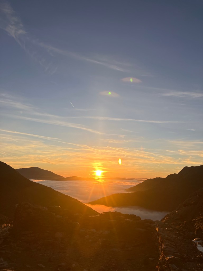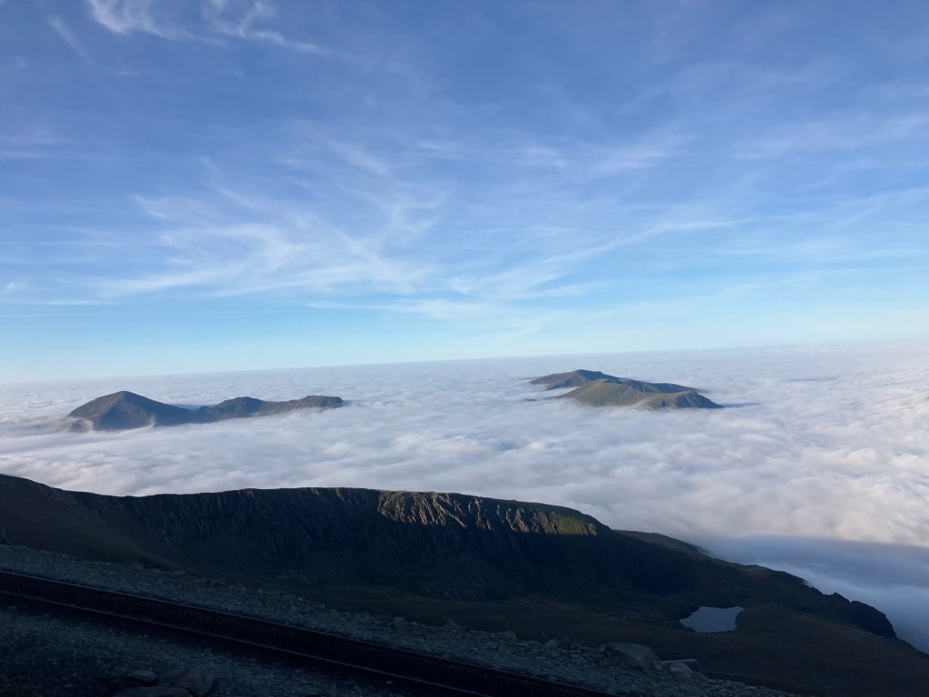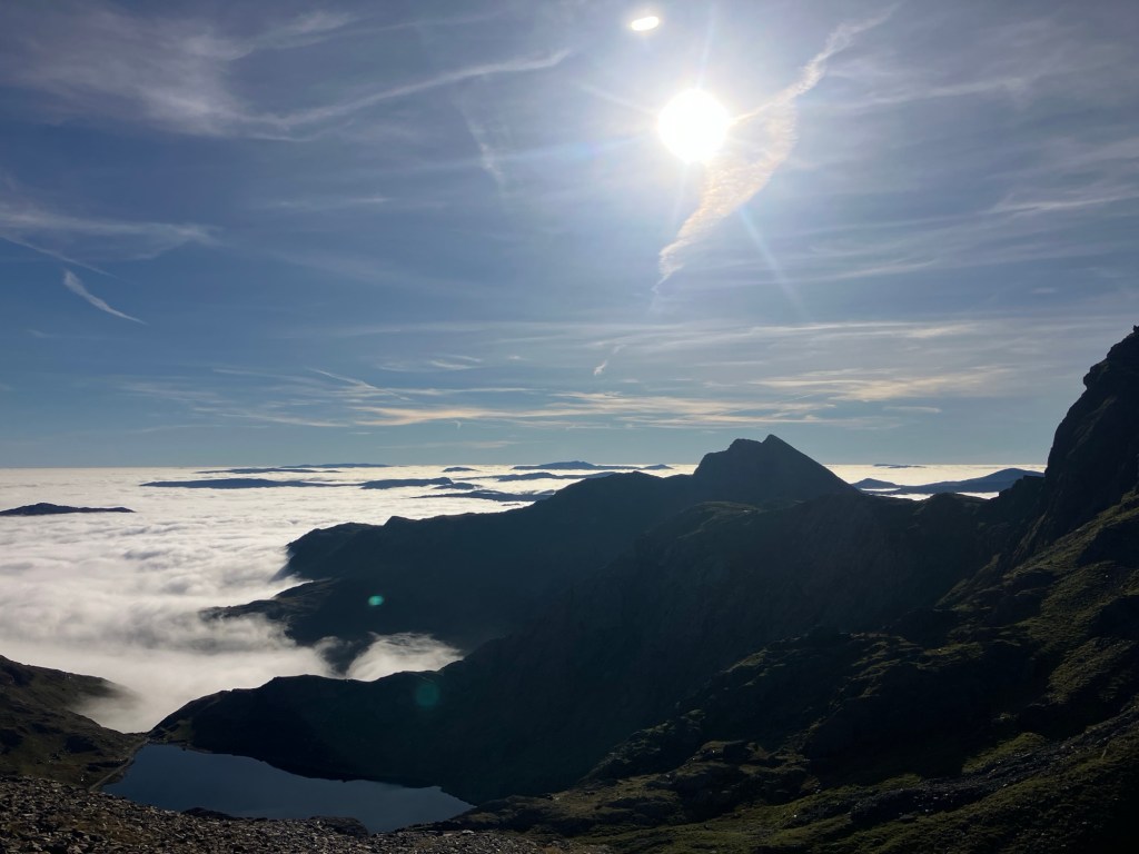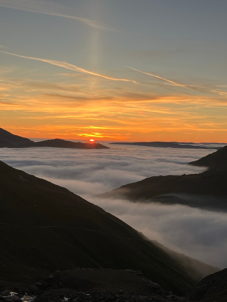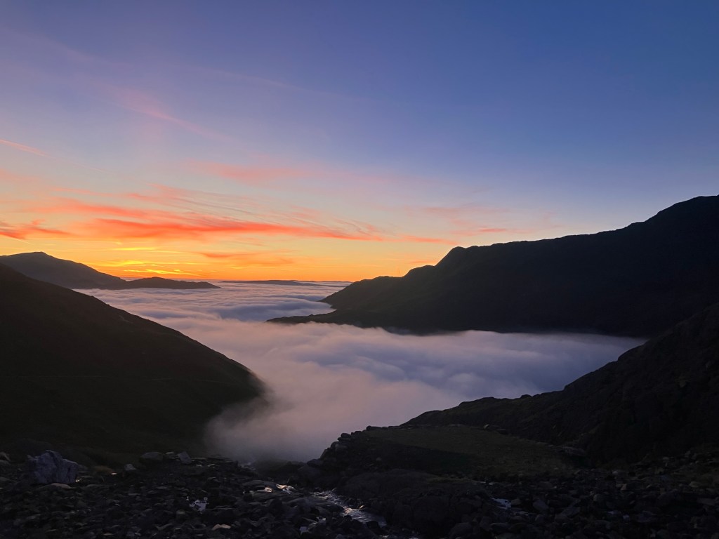 The summit pyramid glowed pink then orange as we ascended, then over the Col, a sea of clouds swept over to Ireland, with just a few mountain tops high enough to stand clear like little islands.