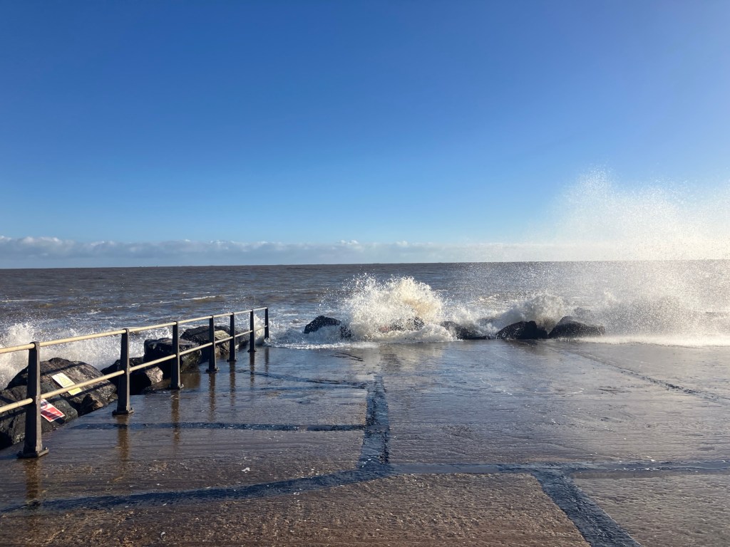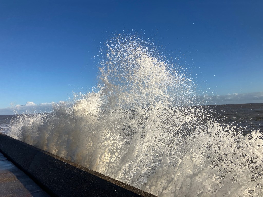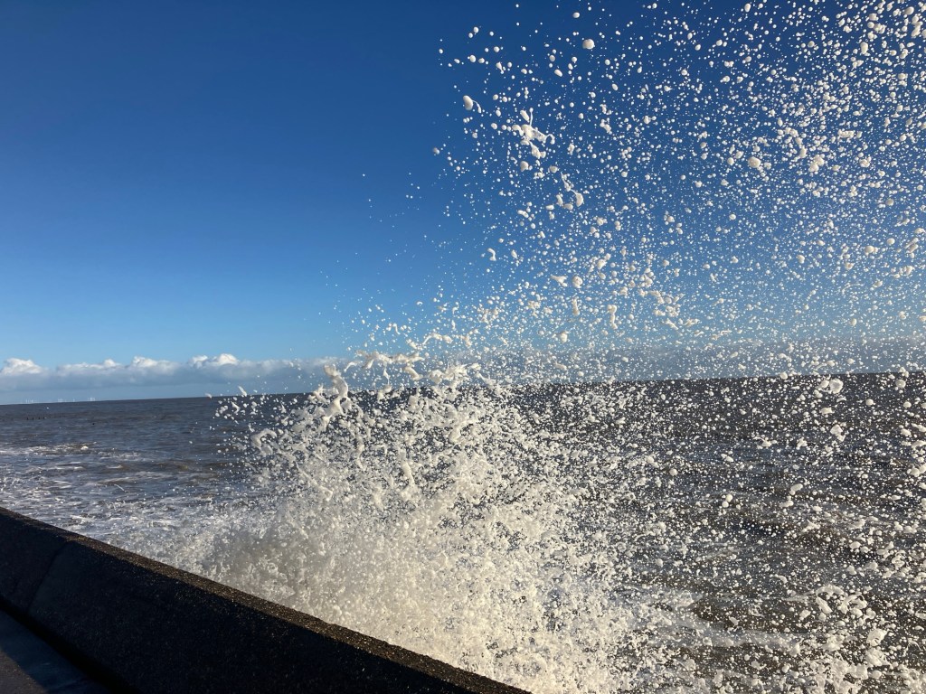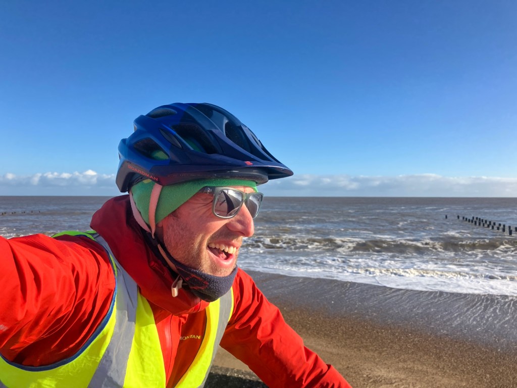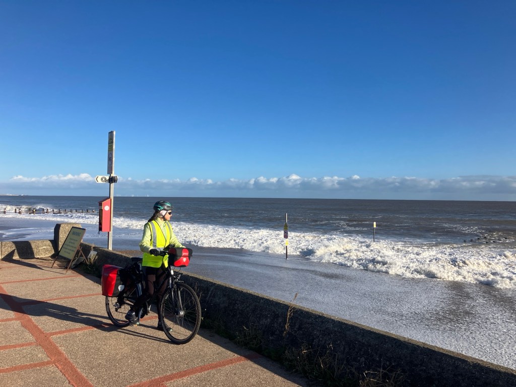 The final day on our cycle traverse of the east coast of England, and what a day to finish on! Crisp blue skies, a distinctly wintery feel and a dramatic high tide was what greeted us after leaving ‘Howard’s Place’ in Lowestoft.