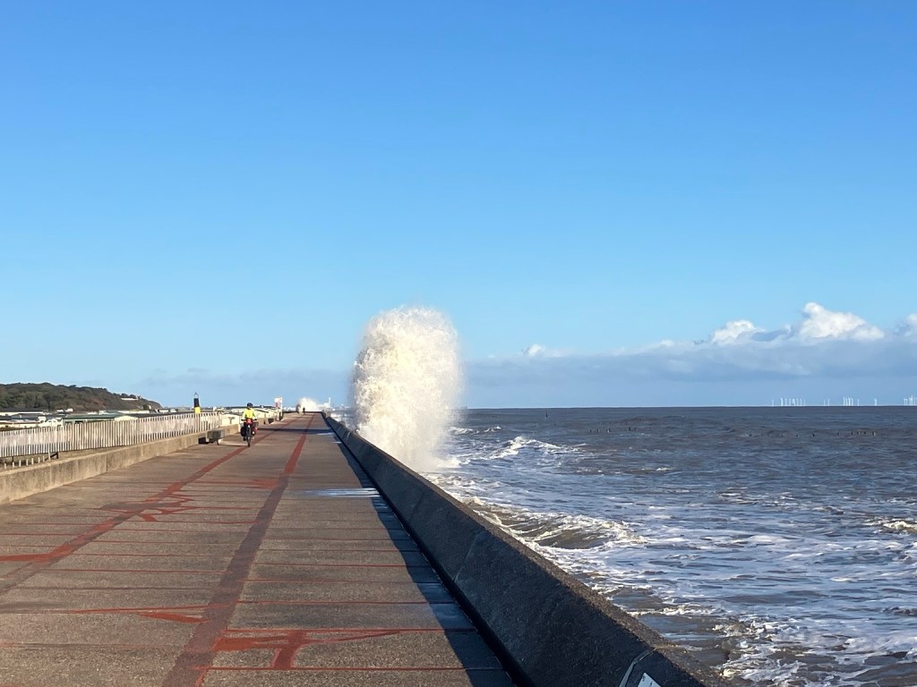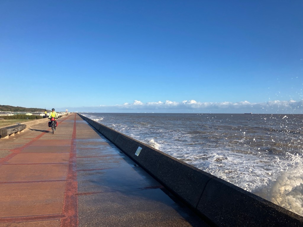 Luckily it was easy to see where and when the waves would crash up the sea defences and with the sun in our eyes, we blasted along as fast as we could between the sets.