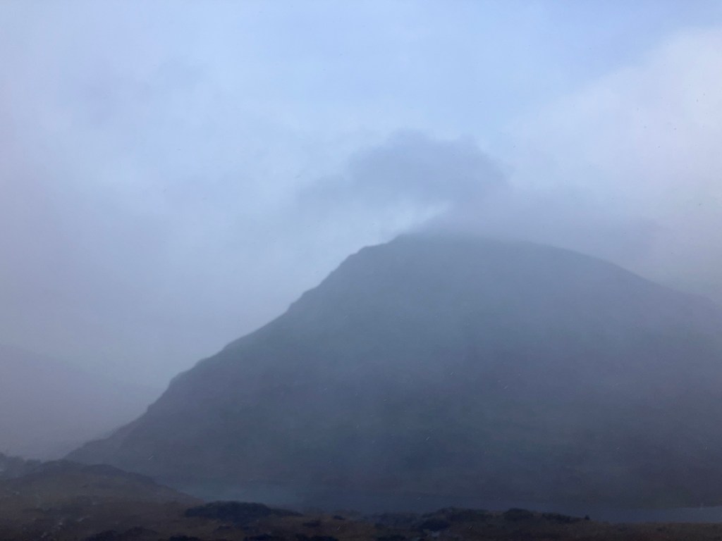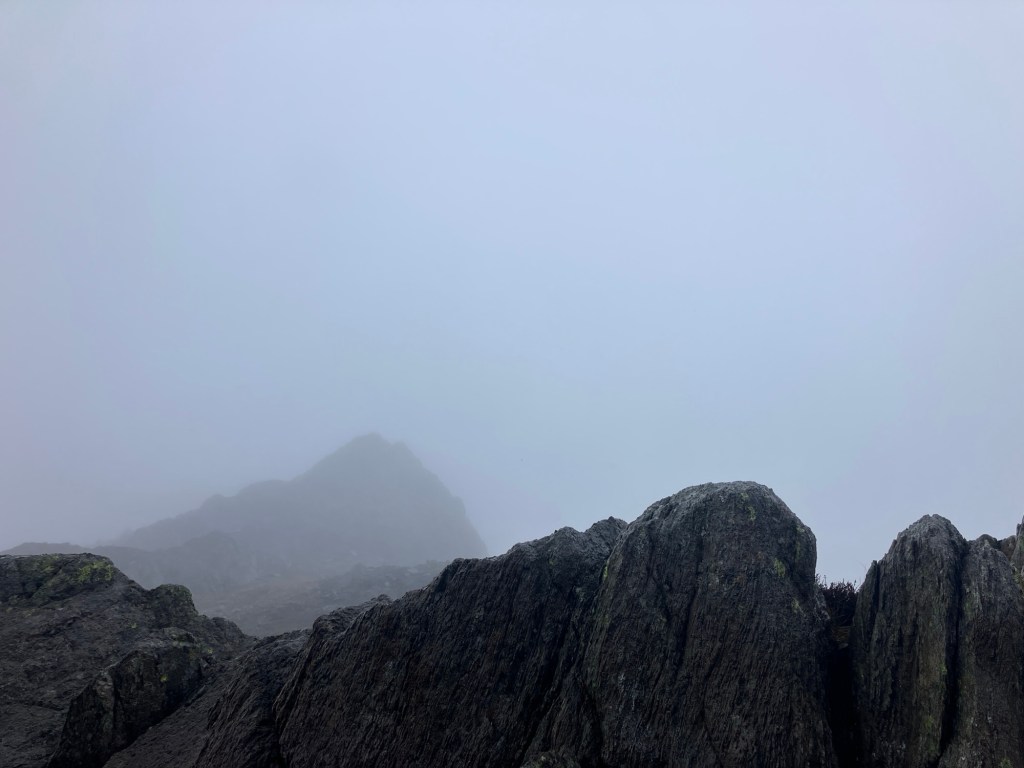 We could just make out the south summit of Tryfan from the South Col, and perhaps we could have carried on? We put it to a vote and ended with a 50/50 split. As we stood discussing our options and the risk/benefit of continuing a huge gust of wind blew through scattering us about and making the decision for us!