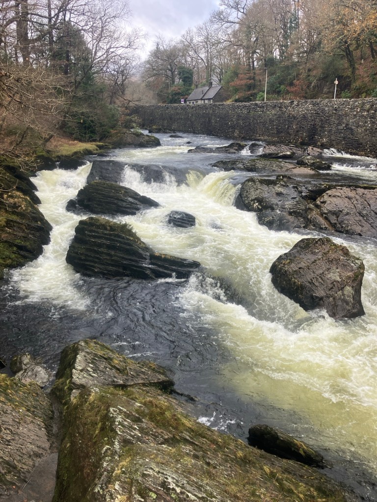 We stuck to the lowlands though, following the Llugwy on a saturated footpath to Plas y Brenin…