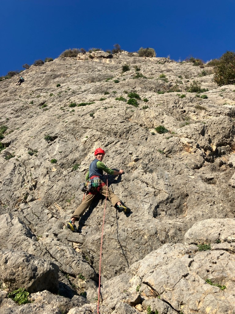 The climbing was fantastic. Plenty of bolts, steep but slabby and well covered in positive holds. And most importantly, bathed in sunshine below a deep blue sky. At 80m in length, our new rope is the longest we’ve ever bought, so we made sure the routes we did were 40m to justify the purchase! There are loads of routes all packed into a small area, which makes them a bit ‘samey’, but also means that you can pretty much just look up and follow any line of bolts to the top. Which is exactly what we did!