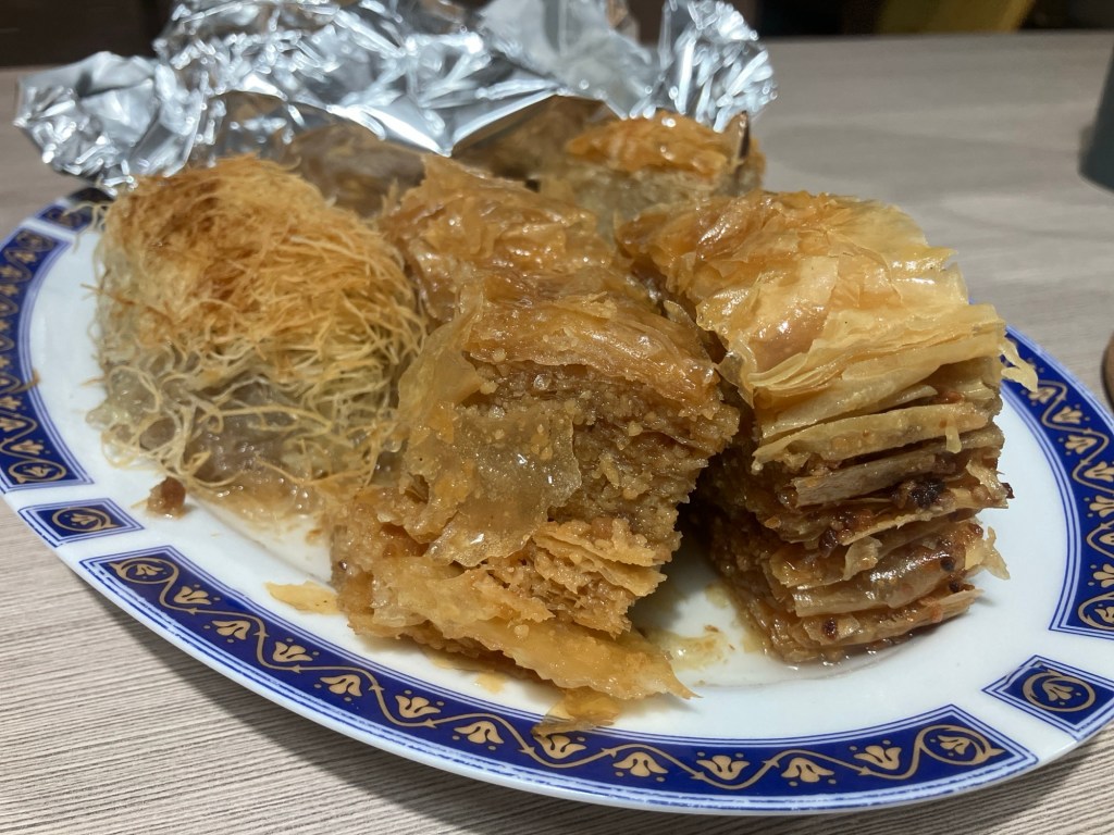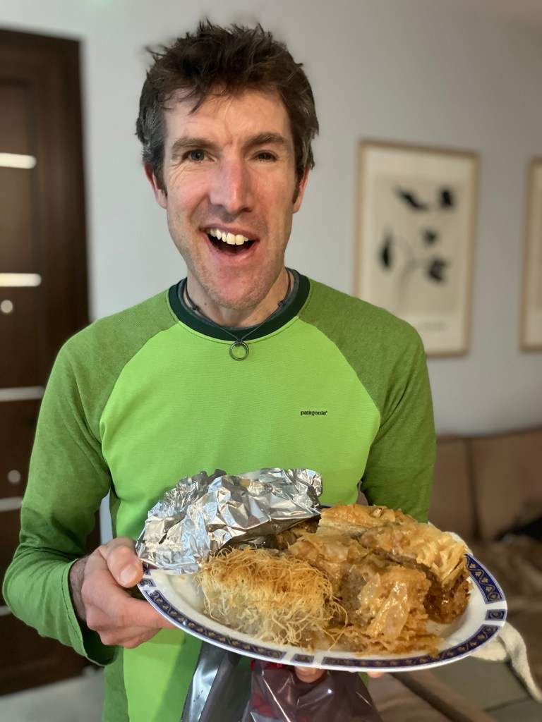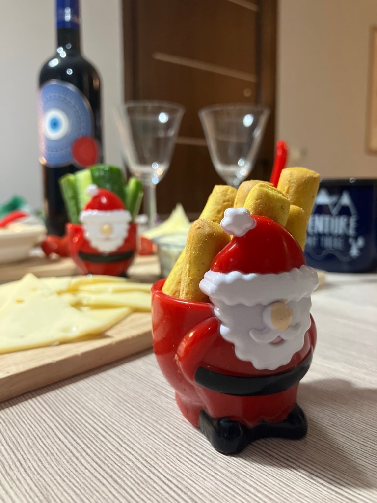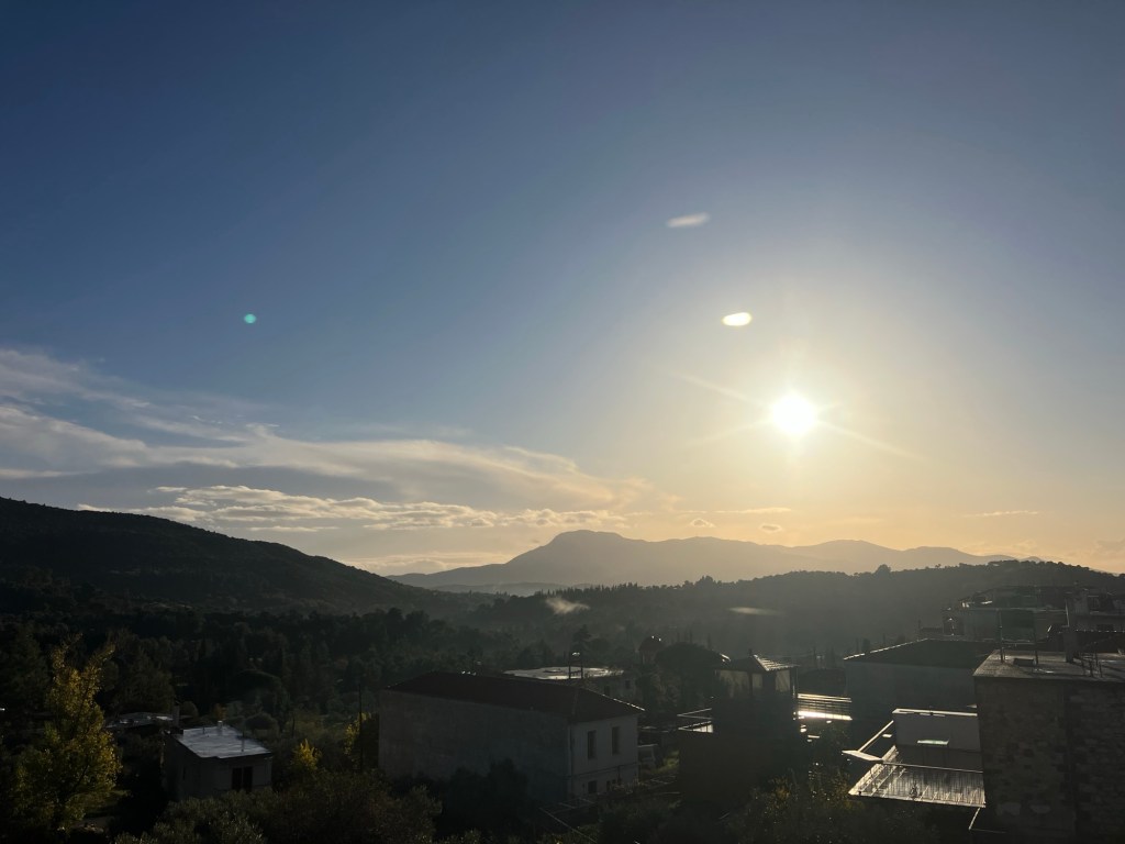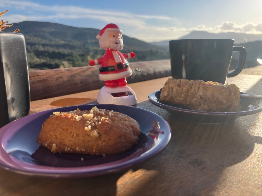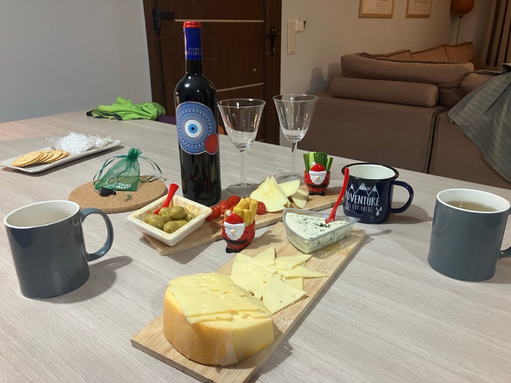 The ‘meal’ (extended grazing), had a fabulous local cheese board starter, accompanied by a a glass of Greek wine. Then after a shower and a change of clothes, the main course involved fresh quesadillas, and the dessert, more cakes and a honey yogurt pot. The remainder of the evening was spent on phone calls and FaceTimes to the rest of the family around the world, each having their own ‘traditional’ day!