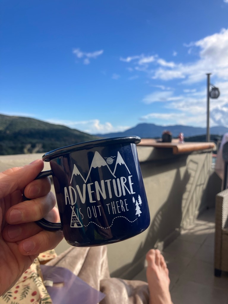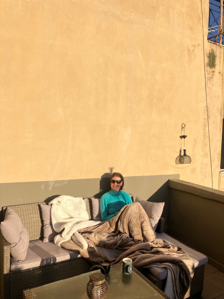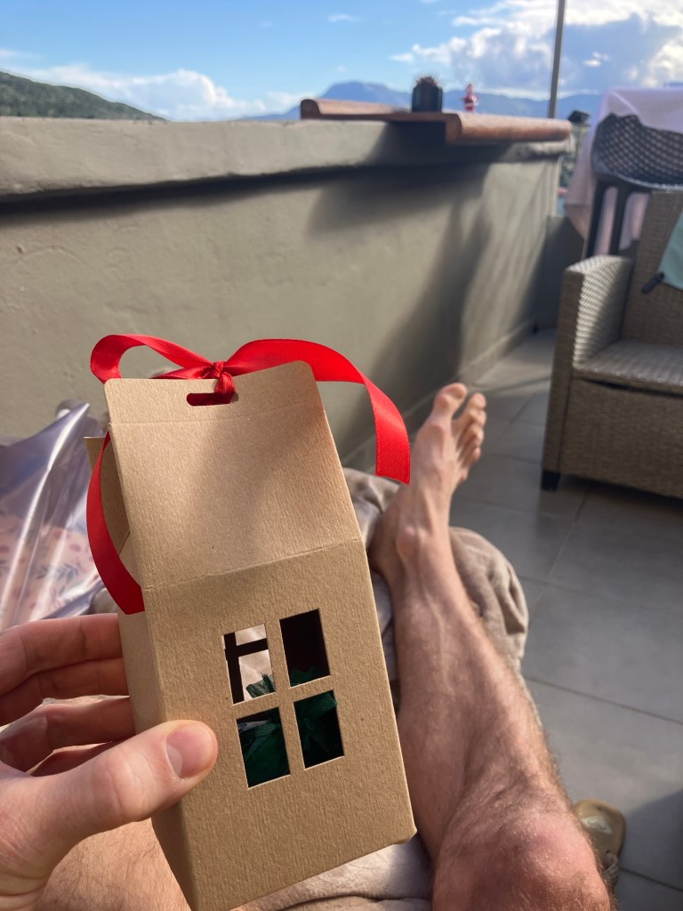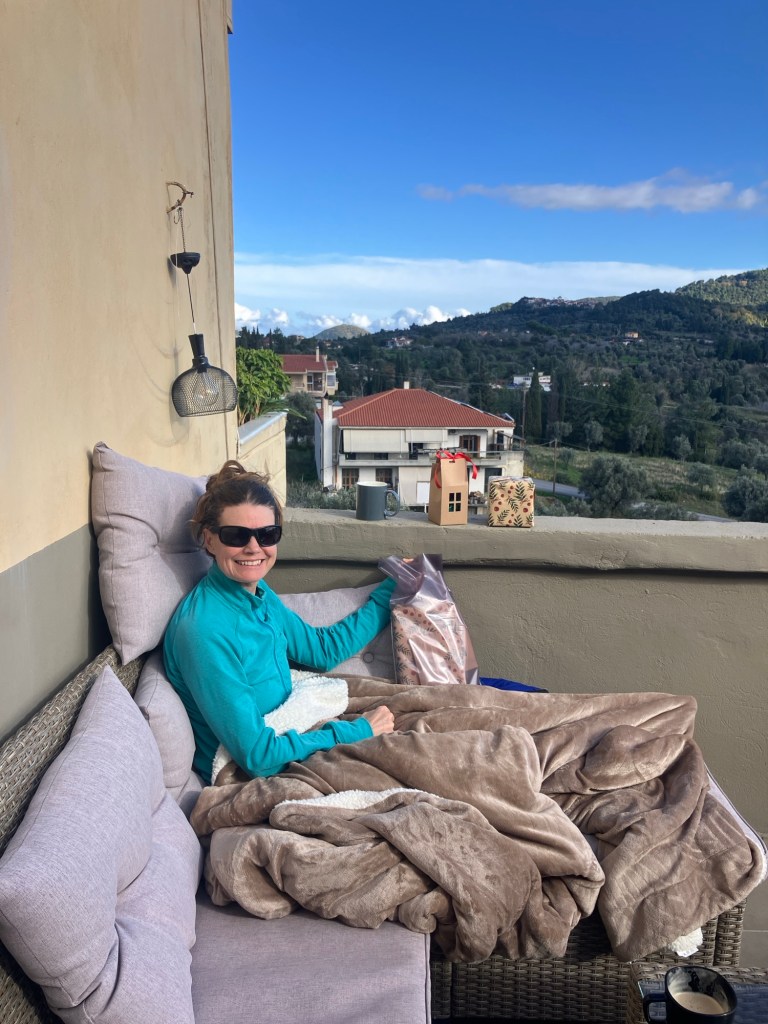 Having eaten our (second) breakfast on arrival at the beach, once we got out and dried off, we decided to get back to the warmth of the balcony as it was completely sheltered from the slight, (yet cooling), breeze. We warmed up under and enormous fleece blanket, before opening the Christmas presents from our host.